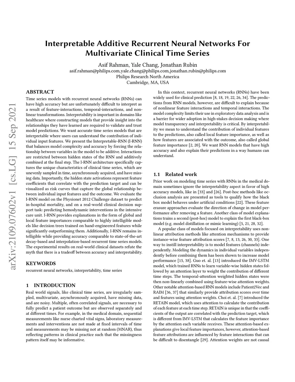 Time series models with recurrent neural networks (RNNs) can have high accuracy but are unfortunately difficult to interpret as a result of feature-interactions, temporal-interactions, and non-linear transformations. Interpretability is important in domains like healthcare where constructing models that provide insight into the relationships they have learned are required to validate and trust model predictions. We want accurate time series models where users can understand the contribution of individual input features. We present the Interpretable-RNN (I-RNN) that balances model complexity and accuracy by forcing the relationship between variables in the model to be additive. Interactions are restricted between hidden states of the RNN and additively combined at the final step. I-RNN specifically captures the unique characteristics of clinical time series, which are unevenly sampled in time, asynchronously acquired, and have missing data. Importantly, the hidden state activations represent feature coefficients that correlate with the prediction target and can be visualized as risk curves that capture the global relationship between individual input features and the outcome. We evaluate the I-RNN model on the Physionet 2012 Challenge dataset to predict in-hospital mortality, and on a real-world clinical decision support task: predicting hemodynamic interventions in the intensive care unit. I-RNN provides explanations in the form of global and local feature importances comparable to highly intelligible models like decision trees trained on hand-engineered features while significantly outperforming them. I-RNN remains intelligible while providing accuracy comparable to state-of-the-art decay-based and interpolation-based recurrent time series models. The experimental results on real-world clinical datasets refute the myth that there is a tradeoff between accuracy and interpretability.
