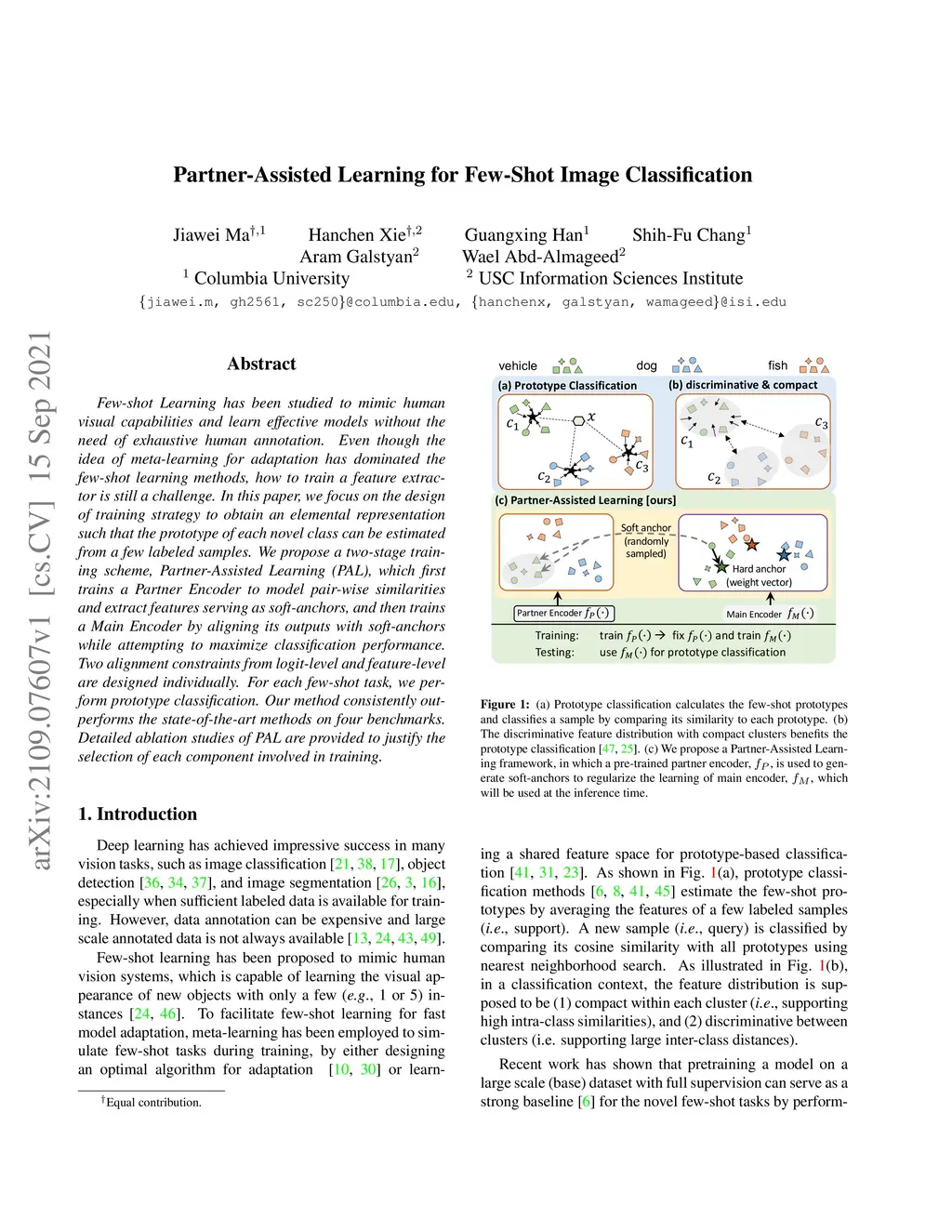 Few-shot Learning has been studied to mimic human visual capabilities and learn effective models without the need of exhaustive human annotation. Even though the idea of meta-learning for adaptation has dominated the few-shot learning methods, how to train a feature extractor is still a challenge. In this paper, we focus on the design of training strategy to obtain an elemental representation such that the prototype of each novel class can be estimated from a few labeled samples. We propose a two-stage training scheme, Partner-Assisted Learning (PAL), which first trains a partner encoder to model pair-wise similarities and extract features serving as soft-anchors, and then trains a main encoder by aligning its outputs with soft-anchors while attempting to maximize classification performance. Two alignment constraints from logit-level and feature-level are designed individually. For each few-shot task, we perform prototype classification. Our method consistently outperforms the state-of-the-art method on four benchmarks. Detailed ablation studies of PAL are provided to justify the selection of each component involved in training.