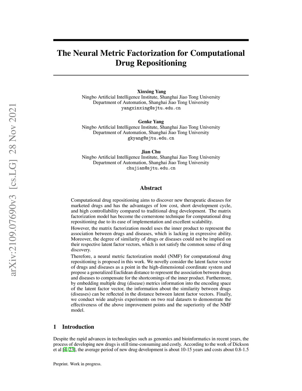 Computational drug repositioning aims to discover new therapeutic diseases for marketed drugs and has the advantages of low cost, short development cycle, and high controllability compared to traditional drug development. The matrix factorization model has become the cornerstone technique for computational drug repositioning due to its ease of implementation and excellent scalability. However, the matrix factorization model uses the inner product to represent the association between drugs and diseases, which is lacking in expressive ability. Moreover, the degree of similarity of drugs or diseases could not be implied on their respective latent factor vectors, which is not satisfy the common sense of drug discovery. Therefore, a neural metric factorization model (NMF) for computational drug repositioning is proposed in this work. We novelly consider the latent factor vector of drugs and diseases as a point in the high-dimensional coordinate system and propose a generalized Euclidean distance to represent the association between drugs and diseases to compensate for the shortcomings of the inner product. Furthermore, by embedding multiple drug (disease) metrics information into the encoding space of the latent factor vector, the information about the similarity between drugs (diseases) can be reflected in the distance between latent factor vectors. Finally, we conduct wide analysis experiments on two real datasets to demonstrate the effectiveness of the above improvement points and the superiority of the NMF model.