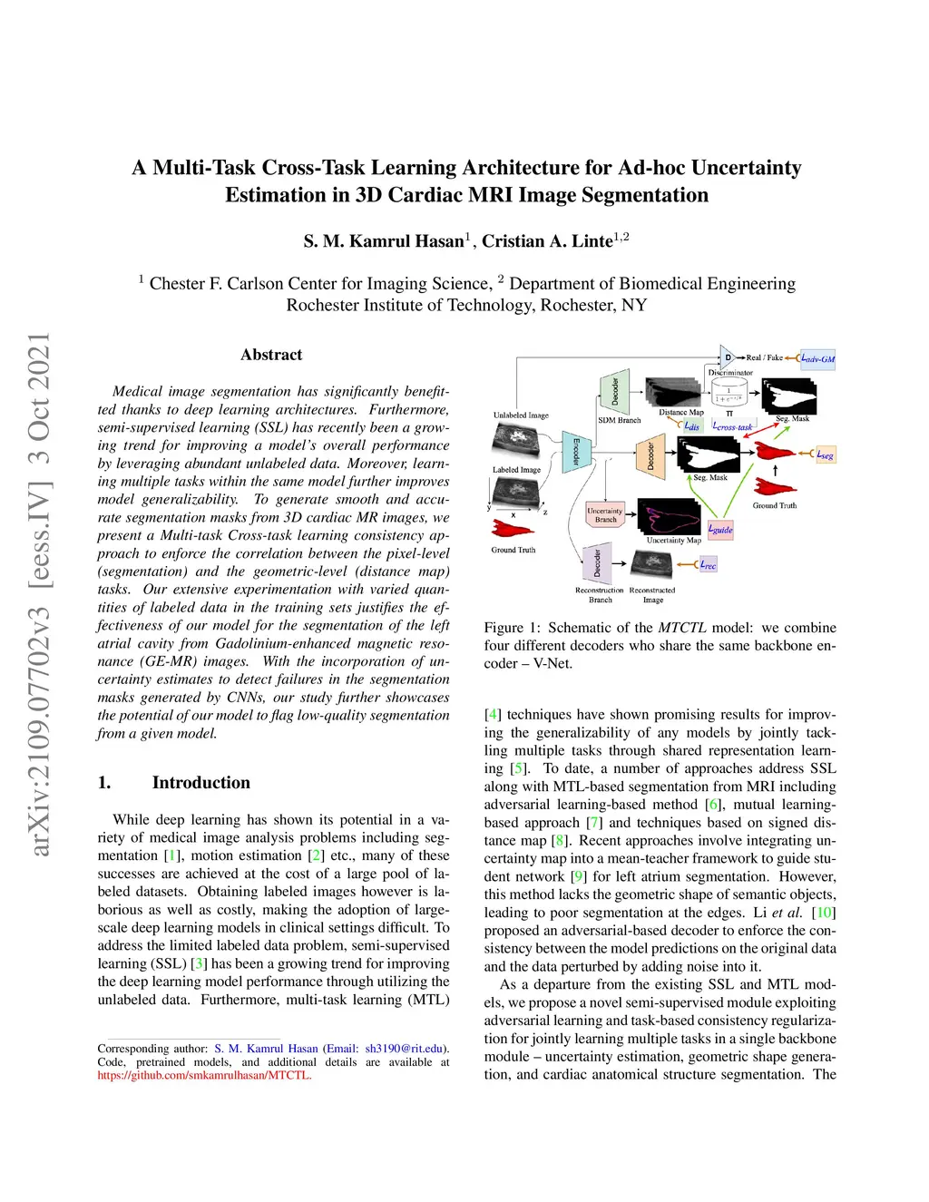 Medical image segmentation has significantly benefitted thanks to deep learning architectures. Furthermore, semi-supervised learning (SSL) has recently been a growing trend for improving a model's overall performance by leveraging abundant unlabeled data. Moreover, learning multiple tasks within the same model further improves model generalizability. To generate smoother and accurate segmentation masks from 3D cardiac MR images, we present a Multi-task Cross-task learning consistency approach to enforce the correlation between the pixel-level (segmentation) and the geometric-level (distance map) tasks. Our extensive experimentation with varied quantities of labeled data in the training sets justifies the effectiveness of our model for the segmentation of the left atrial cavity from Gadolinium-enhanced magnetic resonance (GE-MR) images. With the incorporation of uncertainty estimates to detect failures in the segmentation masks generated by CNNs, our study further showcases the potential of our model to flag low-quality segmentation from a given model.
