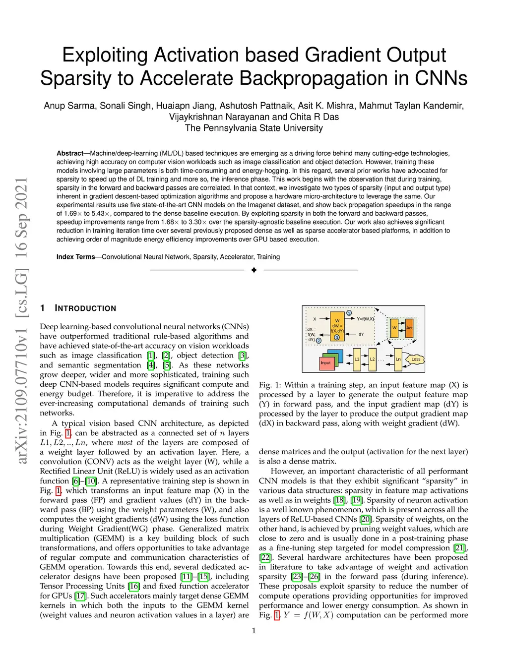 Machine/deep-learning (ML/DL) based techniques are emerging as a driving force behind many cutting-edge technologies, achieving high accuracy on computer vision workloads such as image classification and object detection. However, training these models involving large parameters is both time-consuming and energy-hogging. In this regard, several prior works have advocated for sparsity to speed up the of DL training and more so, the inference phase. This work begins with the observation that during training, sparsity in the forward and backward passes are correlated. In that context, we investigate two types of sparsity (input and output type) inherent in gradient descent-based optimization algorithms and propose a hardware micro-architecture to leverage the same. Our experimental results use five state-of-the-art CNN models on the Imagenet dataset, and show back propagation speedups in the range of 1.69 to 5.43, compared to the dense baseline execution. By exploiting sparsity in both the forward and backward passes, speedup improvements range from 1.68 to 3.30 over the sparsity-agnostic baseline execution. Our work also achieves significant reduction in training iteration time over several previously proposed dense as well as sparse accelerator based platforms, in addition to achieving order of magnitude energy efficiency improvements over GPU based execution.