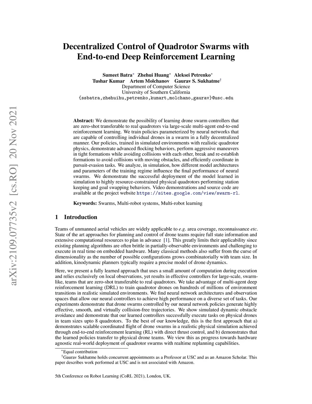 We demonstrate the possibility of learning drone swarm controllers that are zero-shot transferable to real quadrotors via large-scale multi-agent end-to-end reinforcement learning. We train policies parameterized by neural networks that are capable of controlling individual drones in a swarm in a fully decentralized manner. Our policies, trained in simulated environments with realistic quadrotor physics, demonstrate advanced flocking behaviors, perform aggressive maneuvers in tight formations while avoiding collisions with each other, break and re-establish formations to avoid collisions with moving obstacles, and efficiently coordinate in pursuit-evasion tasks. We analyze, in simulation, how different model architectures and parameters of the training regime influence the final performance of neural swarms. We demonstrate the successful deployment of the model learned in simulation to highly resource-constrained physical quadrotors performing station keeping and goal swapping behaviors. Code and video demonstrations are available on the project website at https://sites.google.com/view/swarm-rl.