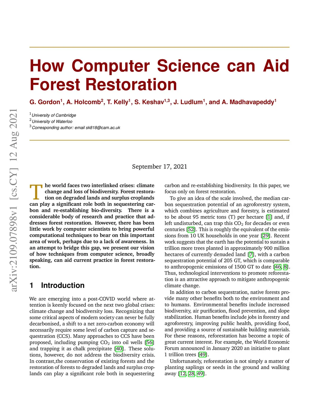 The world faces two interlinked crises: climate change and loss of biodiversity. Forest restoration on degraded lands and surplus croplands can play a significant role both in sequestering carbon and re-establishing bio-diversity. There is a considerable body of research and practice that addresses forest restoration. However, there has been little work by computer scientists to bring powerful computational techniques to bear on this important area of work, perhaps due to a lack of awareness. In an attempt to bridge this gap, we present our vision of how techniques from computer science, broadly speaking, can aid current practice in forest restoration.