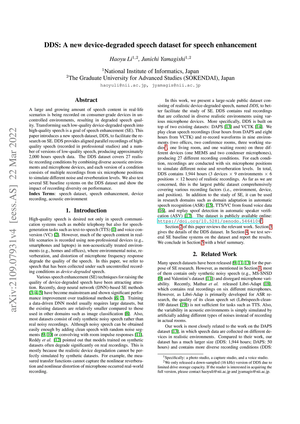 A large and growing amount of speech content in real-life scenarios is being recorded on consumer-grade devices in uncontrolled environments, resulting in degraded speech quality. Transforming such low-quality device-degraded speech into high-quality speech is a goal of speech enhancement (SE). This paper introduces a new speech dataset, DDS, to facilitate the research on SE. DDS provides aligned parallel recordings of high-quality speech (recorded in professional studios) and a number of versions of low-quality speech, producing approximately 2,000 hours speech data. The DDS dataset covers 27 realistic recording conditions by combining diverse acoustic environments and microphone devices, and each version of a condition consists of multiple recordings from six microphone positions to simulate different noise and reverberation levels. We also test several SE baseline systems on the DDS dataset and show the impact of recording diversity on performance.