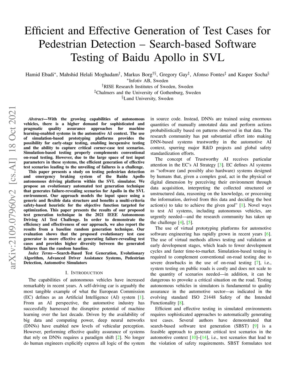 With the growing capabilities of autonomous vehicles, there is a higher demand for sophisticated and pragmatic quality assurance approaches for machine learning-enabled systems in the automotive AI context. The use of simulation-based prototyping platforms provides the possibility for early-stage testing, enabling inexpensive testing and the ability to capture critical corner-case test scenarios. Simulation-based testing properly complements conventional on-road testing. However, due to the large space of test input parameters in these systems, the efficient generation of effective test scenarios leading to the unveiling of failures is a challenge. This paper presents a study on testing pedestrian detection and emergency braking system of the Baidu Apollo autonomous driving platform within the SVL simulator. We propose an evolutionary automated test generation technique that generates failure-revealing scenarios for Apollo in the SVL environment. Our approach models the input space using a generic and flexible data structure and benefits a multi-criteria safety-based heuristic for the objective function targeted for optimization. This paper presents the results of our proposed test generation technique in the 2021 IEEE Autonomous Driving AI Test Challenge. In order to demonstrate the efficiency and effectiveness of our approach, we also report the results from a baseline random generation technique. Our evaluation shows that the proposed evolutionary test case generator is more effective at generating failure-revealing test cases and provides higher diversity between the generated failures than the random baseline.