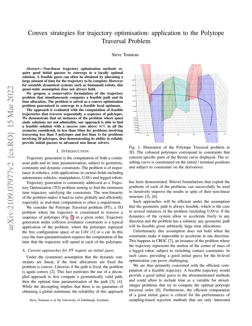 Non-linear Trajectory Optimisation (TO) methods require good initial guesses to converge to a locally optimal solution. A feasible guess can often be obtained by allocating a large amount of time for the trajectory to complete. However for unstable dynamical systems such as humanoid robots, this quasi-static assumption does not always hold. We propose a conservative formulation of the TO problem that simultaneously computes a feasible path and its time allocation. The problem is solved as an efficient convex optimisation problem guaranteed to converge to a locally optimal solution. The interest of the approach is illustrated with the computation of feasible trajectories that traverse sequentially a sequence of polytopes. We demonstrate that on instances of the problem where the quasi static solutions are not admissible, our approach is able to find a feasible solution with a success rate above in all the scenarios considered, in less than 10ms for problems involving traversing less than 5 polytopes and less than 1s for problems involving 20 polytopes, thus demonstrating its ability to reliably provide initial guesses to advanced non linear solvers.