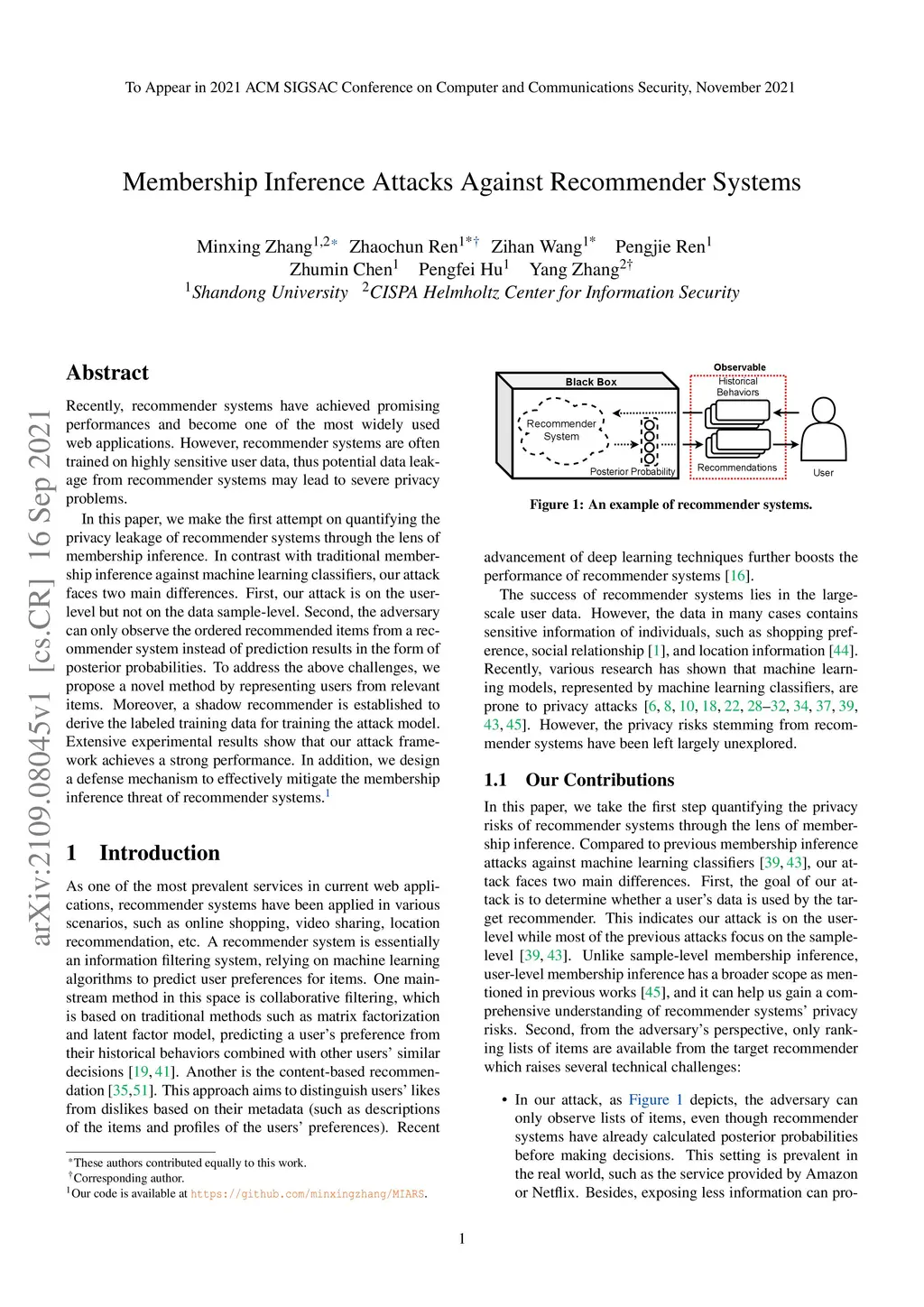 Recently, recommender systems have achieved promising performances and become one of the most widely used web applications. However, recommender systems are often trained on highly sensitive user data, thus potential data leakage from recommender systems may lead to severe privacy problems. In this paper, we make the first attempt on quantifying the privacy leakage of recommender systems through the lens of membership inference. In contrast with traditional membership inference against machine learning classifiers, our attack faces two main differences. First, our attack is on the user-level but not on the data sample-level. Second, the adversary can only observe the ordered recommended items from a recommender system instead of prediction results in the form of posterior probabilities. To address the above challenges, we propose a novel method by representing users from relevant items. Moreover, a shadow recommender is established to derive the labeled training data for training the attack model. Extensive experimental results show that our attack framework achieves a strong performance. In addition, we design a defense mechanism to effectively mitigate the membership inference threat of recommender systems.