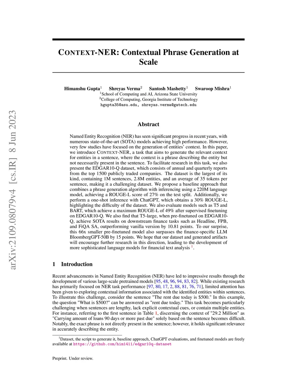 Named Entity Recognition (NER) has seen significant progress in recent years, with numerous state-of-the-art (SOTA) models achieving high performance. However, very few studies have focused on the generation of entities' context. In this paper, we introduce CONTEXT-NER, a task that aims to generate the relevant context for entities in a sentence, where the context is a phrase describing the entity but not necessarily present in the sentence. To facilitate research in this task, we also present the EDGAR10-Q dataset, which consists of annual and quarterly reports from the top 1500 publicly traded companies. The dataset is the largest of its kind, containing 1M sentences, 2.8M entities, and an average of 35 tokens per sentence, making it a challenging dataset. We propose a baseline approach that combines a phrase generation algorithm with inferencing using a 220M language model, achieving a ROUGE-L score of 27% on the test split. Additionally, we perform a one-shot inference with ChatGPT, which obtains a 30% ROUGE-L, highlighting the difficulty of the dataset. We also evaluate models such as T5 and BART, which achieve a maximum ROUGE-L of 49% after supervised finetuning on EDGAR10-Q. We also find that T5-large, when pre-finetuned on EDGAR10-Q, achieve SOTA results on downstream finance tasks such as Headline, FPB, and FiQA SA, outperforming vanilla version by 10.81 points. To our surprise, this 66x smaller pre-finetuned model also surpasses the finance-specific LLM BloombergGPT-50B by 15 points. We hope that our dataset and generated artifacts will encourage further research in this direction, leading to the development of more sophisticated language models for financial text analysis