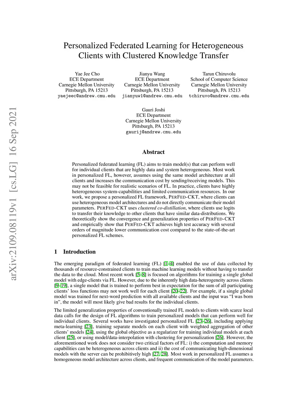 Personalized federated learning (FL) aims to train model(s) that can perform well for individual clients that are highly data and system heterogeneous. Most work in personalized FL, however, assumes using the same model architecture at all clients and increases the communication cost by sending/receiving models. This may not be feasible for realistic scenarios of FL. In practice, clients have highly heterogeneous system-capabilities and limited communication resources. In our work, we propose a personalized FL framework, PerFed-CKT, where clients can use heterogeneous model architectures and do not directly communicate their model parameters. PerFed-CKT uses clustered co-distillation, where clients use logits to transfer their knowledge to other clients that have similar data-distributions. We theoretically show the convergence and generalization properties of PerFed-CKT and empirically show that PerFed-CKT achieves high test accuracy with several orders of magnitude lower communication cost compared to the state-of-the-art personalized FL schemes.