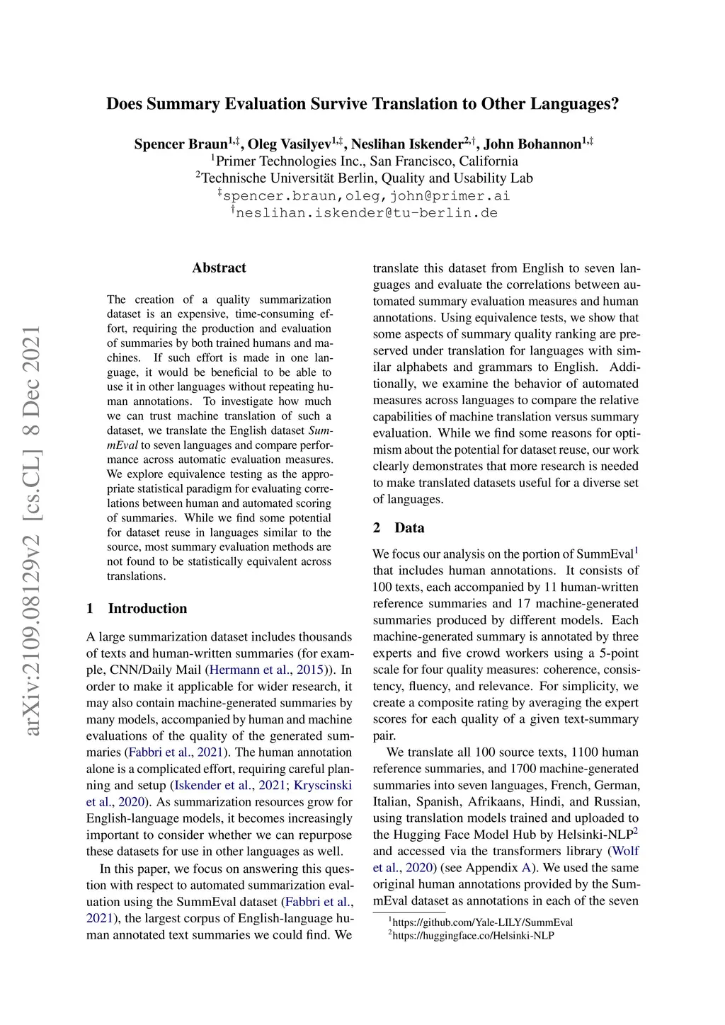 The creation of a quality summarization dataset is an expensive, time-consuming effort, requiring the production and evaluation of summaries by both trained humans and machines. If such effort is made in one language, it would be beneficial to be able to use it in other languages without repeating human annotations. To investigate how much we can trust machine translation of such a dataset, we translate the English dataset SummEval to seven languages and compare performance across automatic evaluation measures. We explore equivalence testing as the appropriate statistical paradigm for evaluating correlations between human and automated scoring of summaries. While we find some potential for dataset reuse in languages similar to the source, most summary evaluation methods are not found to be statistically equivalent across translations.