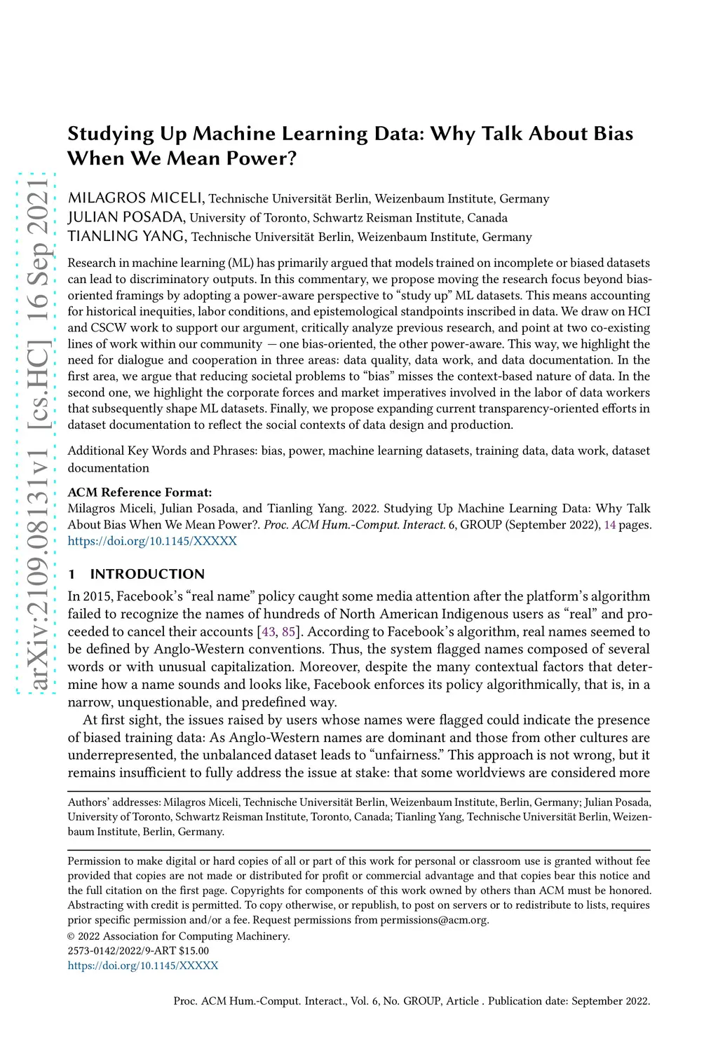 Research in machine learning (ML) has primarily argued that models trained on incomplete or biased datasets can lead to discriminatory outputs. In this commentary, we propose moving the research focus beyond bias-oriented framings by adopting a power-aware perspective to "study up" ML datasets. This means accounting for historical inequities, labor conditions, and epistemological standpoints inscribed in data. We draw on HCI and CSCW work to support our argument, critically analyze previous research, and point at two co-existing lines of work within our community -- one bias-oriented, the other power-aware. This way, we highlight the need for dialogue and cooperation in three areas: data quality, data work, and data documentation. In the first area, we argue that reducing societal problems to "bias" misses the context-based nature of data. In the second one, we highlight the corporate forces and market imperatives involved in the labor of data workers that subsequently shape ML datasets. Finally, we propose expanding current transparency-oriented efforts in dataset documentation to reflect the social contexts of data design and production.