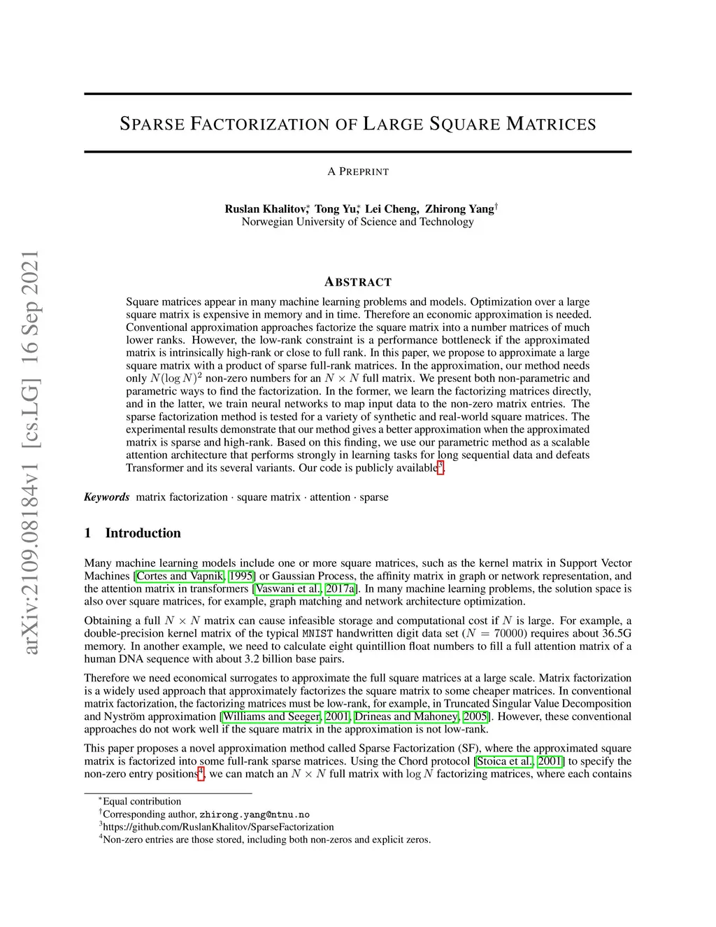 Square matrices appear in many machine learning problems and models. Optimization over a large square matrix is expensive in memory and in time. Therefore an economic approximation is needed. Conventional approximation approaches factorize the square matrix into a number matrices of much lower ranks. However, the low-rank constraint is a performance bottleneck if the approximated matrix is intrinsically high-rank or close to full rank. In this paper, we propose to approximate a large square matrix with a product of sparse full-rank matrices. In the approximation, our method needs only non-zero numbers for an full matrix. We present both non-parametric and parametric ways to find the factorization. In the former, we learn the factorizing matrices directly, and in the latter, we train neural networks to map input data to the non-zero matrix entries. The sparse factorization method is tested for a variety of synthetic and real-world square matrices. The experimental results demonstrate that our method gives a better approximation when the approximated matrix is sparse and high-rank. Based on this finding, we use our parametric method as a scalable attention architecture that performs strongly in learning tasks for long sequential data and defeats Transformer and its several variants.
