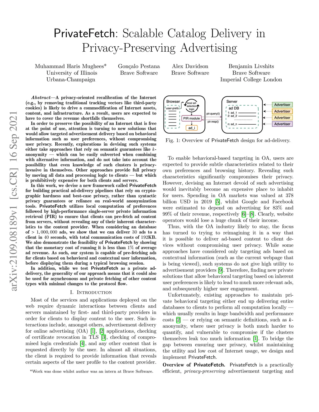 In order to preserve the possibility of an Internet that is free at the point of use, attention is turning to new solutions that would allow targeted advertisement delivery based on behavioral information such as user preferences, without compromising user privacy. Recently, explorations in devising such systems either take approaches that rely on semantic guarantees like -anonymity -- which can be easily subverted when combining with alternative information, and do not take into account the possibility that even knowledge of such clusters is privacy-invasive in themselves. Other approaches provide full privacy by moving all data and processing logic to clients -- but which is prohibitively expensive for both clients and servers. In this work, we devise a new framework called PrivateFetch for building practical ad-delivery pipelines that rely on cryptographic hardness and best-case privacy, rather than syntactic privacy guarantees or reliance on real-world anonymization tools. PrivateFetch utilizes local computation of preferences followed by high-performance single-server private information retrieval (PIR) to ensure that clients can pre-fetch ad content from servers, without revealing any of their inherent characteristics to the content provider. When considering an database of ads, we show that we can deliver ads to a client in 40 seconds, with total communication costs of 192KB. We also demonstrate the feasibility of PrivateFetch by showing that the monetary cost of running it is less than 1% of average ad revenue. As such, our system is capable of pre-fetching ads for clients based on behavioral and contextual user information, before displaying them during a typical browsing session. In addition, while we test PrivateFetch as a private ad-delivery, the generality of our approach means that it could also be used for other content types.