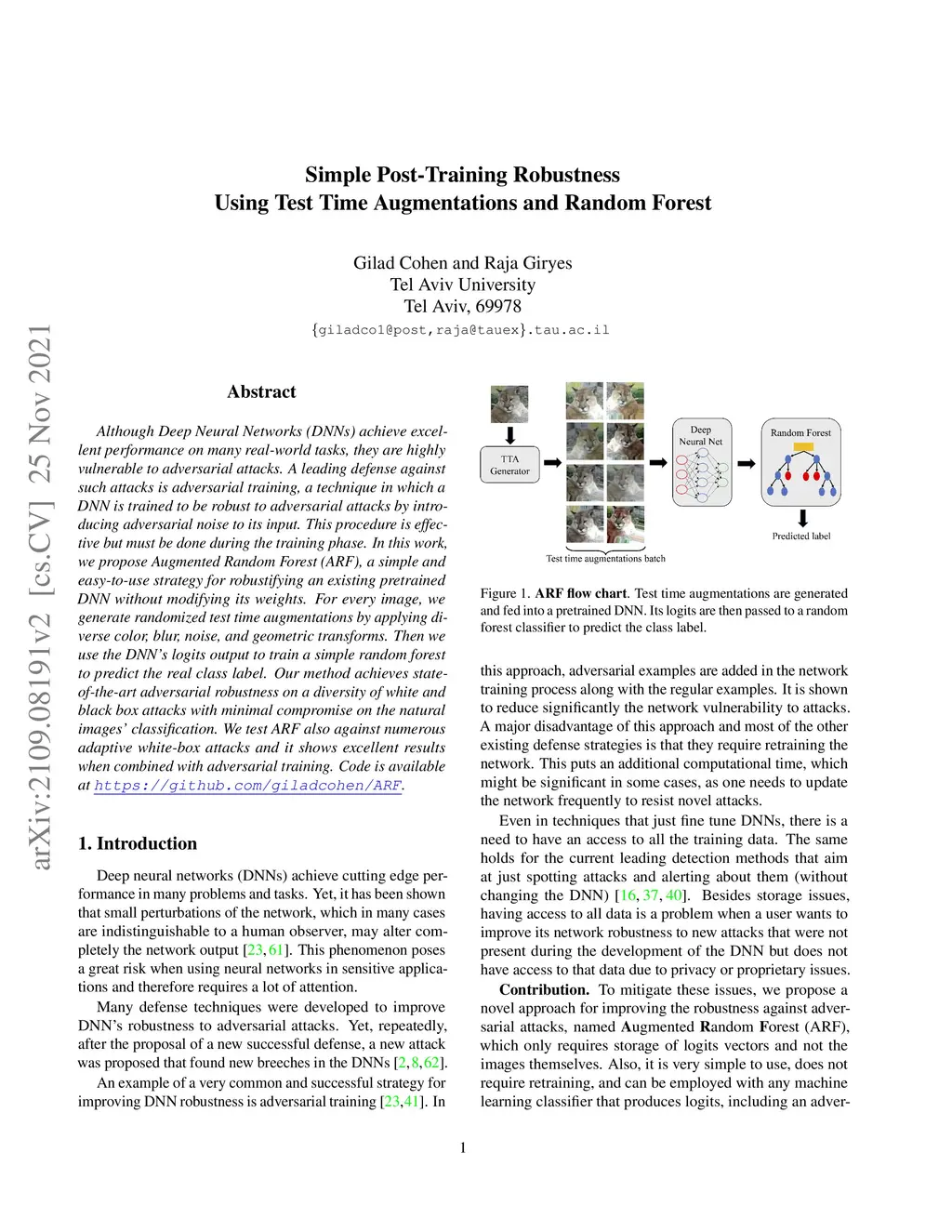 Although Deep Neural Networks (DNNs) achieve excellent performance on many real-world tasks, they are highly vulnerable to adversarial attacks. A leading defense against such attacks is adversarial training, a technique in which a DNN is trained to be robust to adversarial attacks by introducing adversarial noise to its input. This procedure is effective but must be done during the training phase. In this work, we propose Augmented Random Forest (ARF), a simple and easy-to-use strategy for robustifying an existing pretrained DNN without modifying its weights. For every image, we generate randomized test time augmentations by applying diverse color, blur, noise, and geometric transforms. Then we use the DNN's logits output to train a simple random forest to predict the real class label. Our method achieves state-of-the-art adversarial robustness on a diversity of white and black box attacks with minimal compromise on the natural images' classification. We test ARF also against numerous adaptive white-box attacks and it shows excellent results when combined with adversarial training. Code is available at https://github.com/giladcohen/ARF.