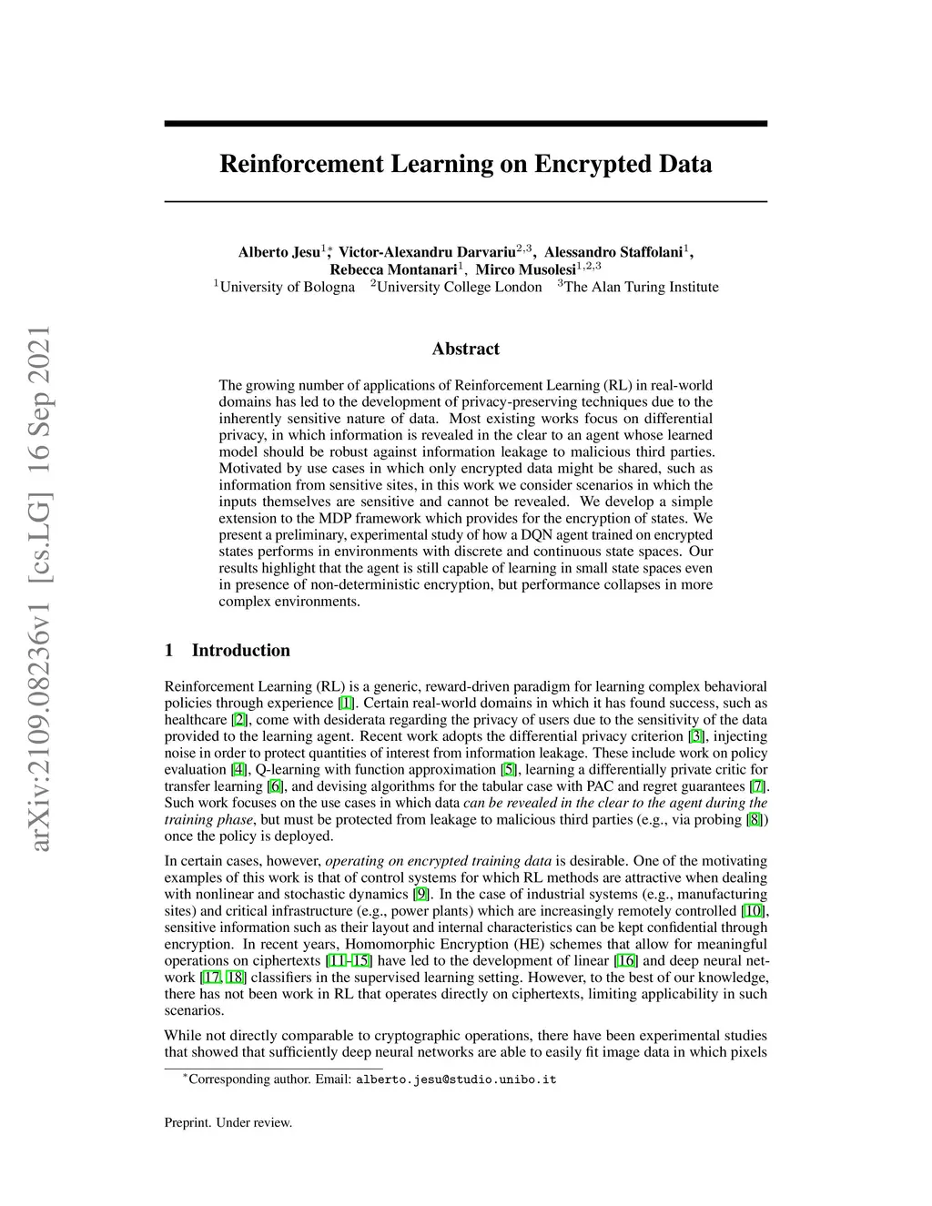 Reinforcement Learning on Encrypted Data