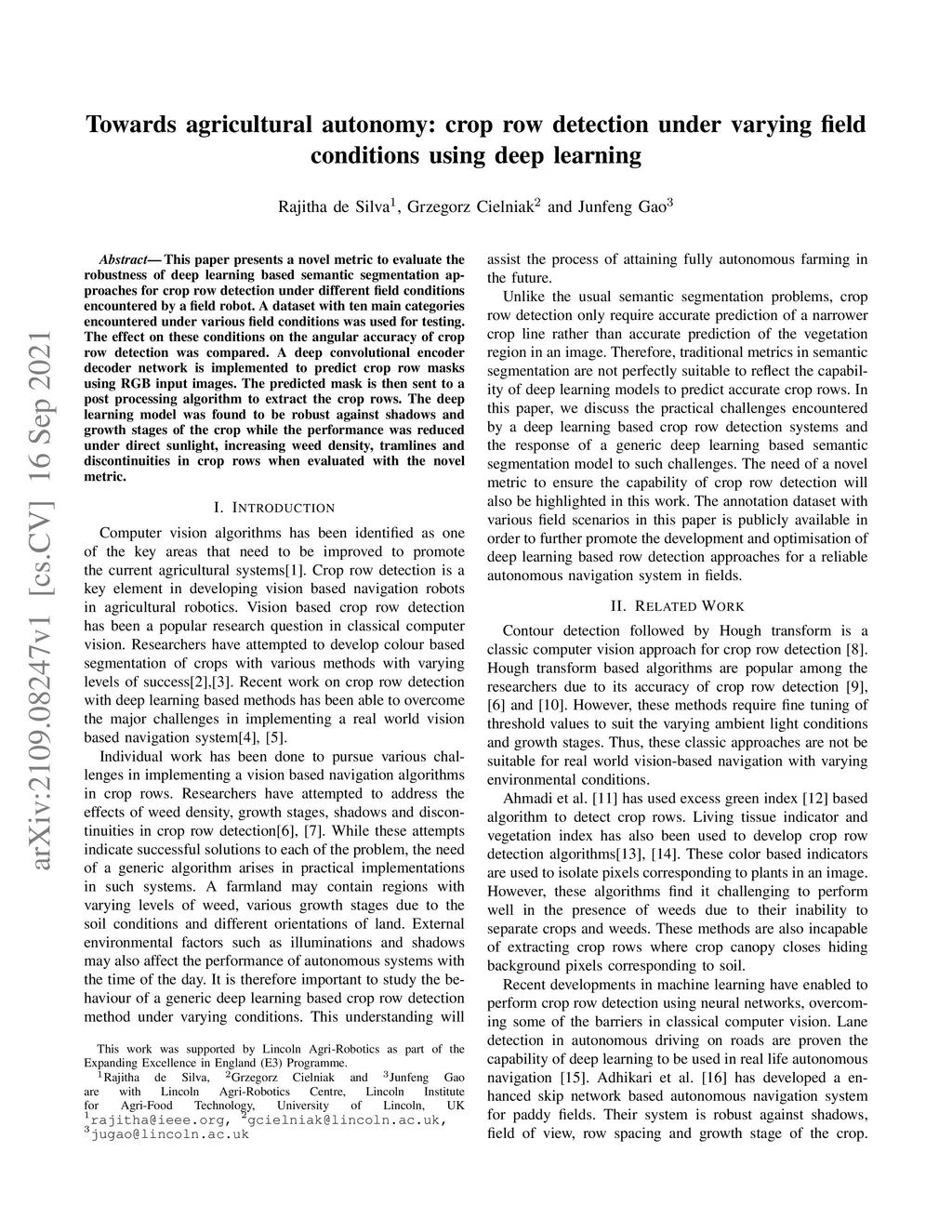 This paper presents a novel metric to evaluate the robustness of deep learning based semantic segmentation approaches for crop row detection under different field conditions encountered by a field robot. A dataset with ten main categories encountered under various field conditions was used for testing. The effect on these conditions on the angular accuracy of crop row detection was compared. A deep convolutional encoder decoder network is implemented to predict crop row masks using RGB input images. The predicted mask is then sent to a post processing algorithm to extract the crop rows. The deep learning model was found to be robust against shadows and growth stages of the crop while the performance was reduced under direct sunlight, increasing weed density, tramlines and discontinuities in crop rows when evaluated with the novel metric.
