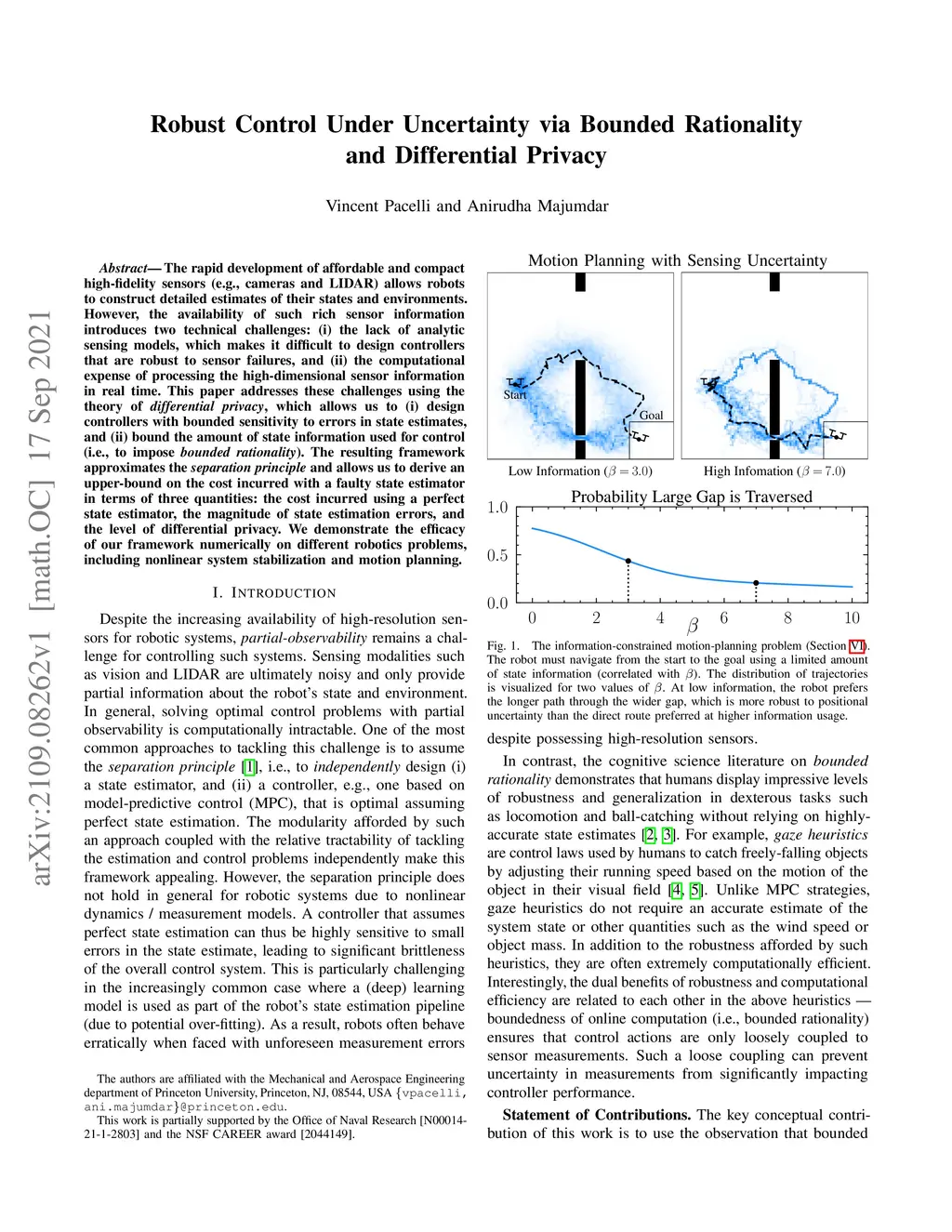 The rapid development of affordable and compact high-fidelity sensors (e.g., cameras and LIDAR) allows robots to construct detailed estimates of their states and environments. However, the availability of such rich sensor information introduces two technical challenges: (i) the lack of analytic sensing models, which makes it difficult to design controllers that are robust to sensor failures, and (ii) the computational expense of processing the high-dimensional sensor information in real time. This paper addresses these challenges using the theory of differential privacy, which allows us to (i) design controllers with bounded sensitivity to errors in state estimates, and (ii) bound the amount of state information used for control (i.e., to impose bounded rationality). The resulting framework approximates the separation principle and allows us to derive an upper-bound on the cost incurred with a faulty state estimator in terms of three quantities: the cost incurred using a perfect state estimator, the magnitude of state estimation errors, and the level of differential privacy. We demonstrate the efficacy of our framework numerically on different robotics problems, including nonlinear system stabilization and motion planning.