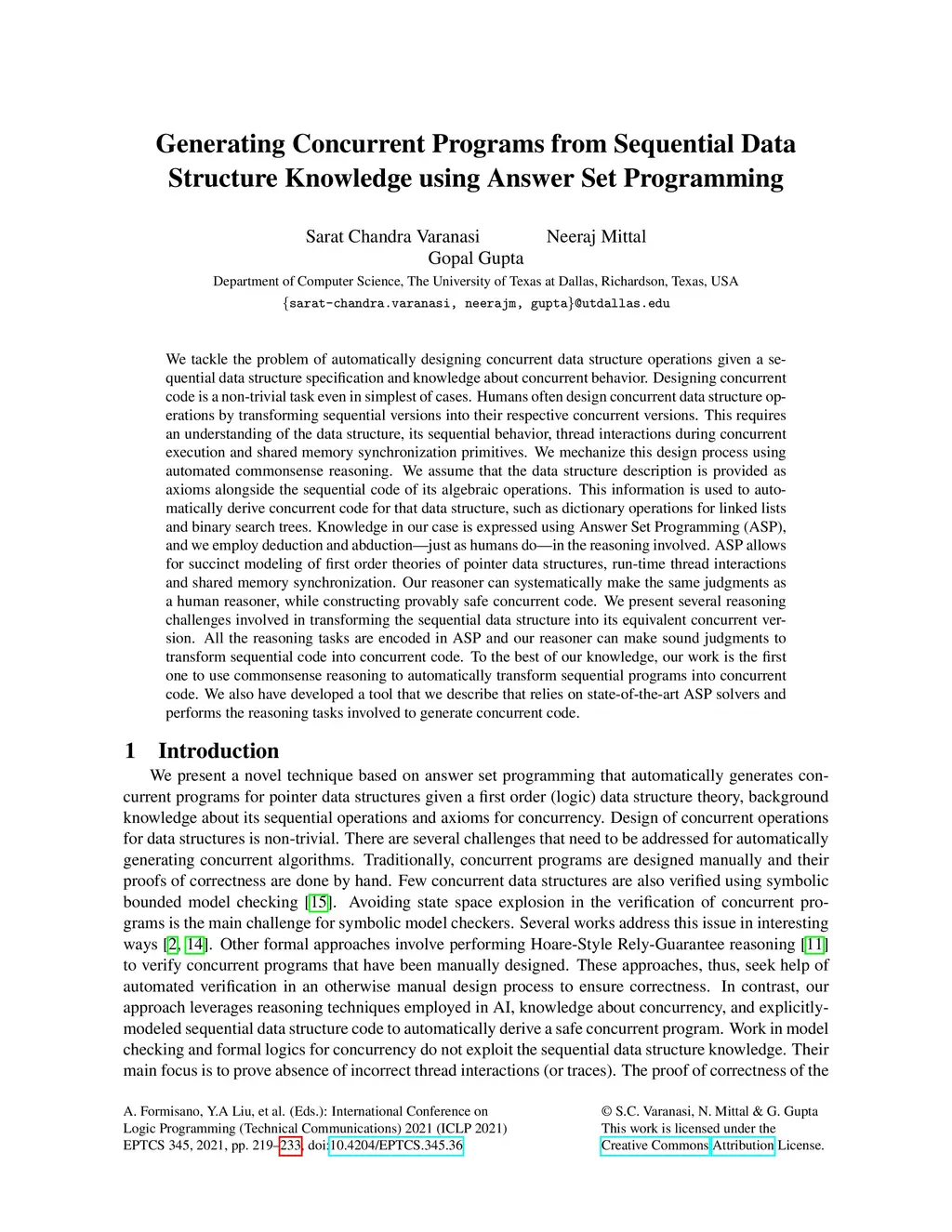 We tackle the problem of automatically designing concurrent data structure operations given a sequential data structure specification and knowledge about concurrent behavior. Designing concurrent code is a non-trivial task even in simplest of cases. Humans often design concurrent data structure operations by transforming sequential versions into their respective concurrent versions. This requires an understanding of the data structure, its sequential behavior, thread interactions during concurrent execution and shared memory synchronization primitives. We mechanize this design process using automated commonsense reasoning. We assume that the data structure description is provided as axioms alongside the sequential code of its algebraic operations. This information is used to automatically derive concurrent code for that data structure, such as dictionary operations for linked lists and binary search trees. Knowledge in our case is expressed using Answer Set Programming (ASP), and we employ deduction and abduction -- just as humans do -- in the reasoning involved. ASP allows for succinct modeling of first order theories of pointer data structures, run-time thread interactions and shared memory synchronization. Our reasoner can systematically make the same judgments as a human reasoner, while constructing provably safe concurrent code. We present several reasoning challenges involved in transforming the sequential data structure into its equivalent concurrent version. All the reasoning tasks are encoded in ASP and our reasoner can make sound judgments to transform sequential code into concurrent code. To the best of our knowledge, our work is the first one to use commonsense reasoning to automatically transform sequential programs into concurrent code. We also have developed a tool that we describe that relies on state-of-the-art ASP solvers and performs the reasoning tasks involved to generate concurrent code.