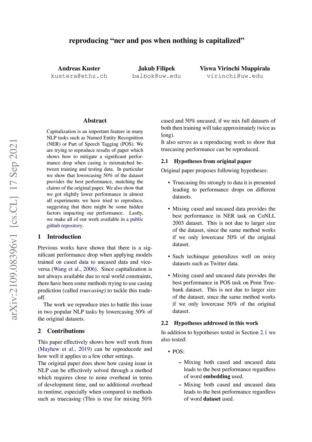 Capitalization is an important feature in many NLP tasks such as Named Entity Recognition (NER) or Part of Speech Tagging (POS). We are trying to reproduce results of paper which shows how to mitigate a significant performance drop when casing is mismatched between training and testing data. In particular we show that lowercasing 50% of the dataset provides the best performance, matching the claims of the original paper. We also show that we got slightly lower performance in almost all experiments we have tried to reproduce, suggesting that there might be some hidden factors impacting our performance. Lastly, we make all of our work available in a public github repository.
