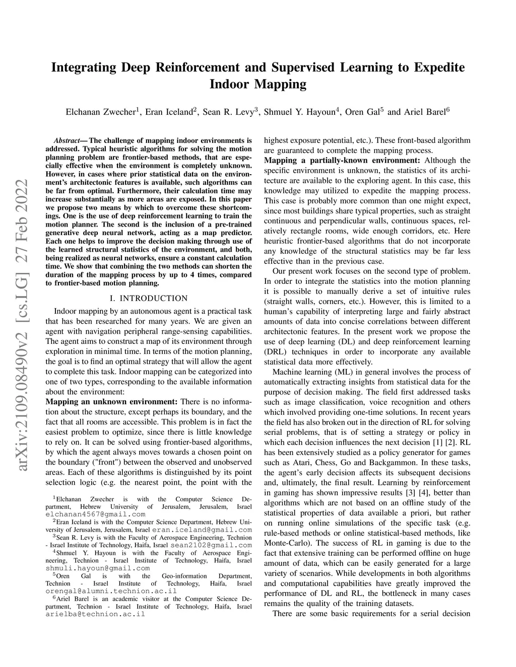 The challenge of mapping indoor environments is addressed. Typical heuristic algorithms for solving the motion planning problem are frontier-based methods, that are especially effective when the environment is completely unknown. However, in cases where prior statistical data on the environment's architectonic features is available, such algorithms can be far from optimal. Furthermore, their calculation time may increase substantially as more areas are exposed. In this paper we propose two means by which to overcome these shortcomings. One is the use of deep reinforcement learning to train the motion planner. The second is the inclusion of a pre-trained generative deep neural network, acting as a map predictor. Each one helps to improve the decision making through use of the learned structural statistics of the environment, and both, being realized as neural networks, ensure a constant calculation time. We show that combining the two methods can shorten the duration of the mapping process by up to 4 times, compared to frontier-based motion planning.