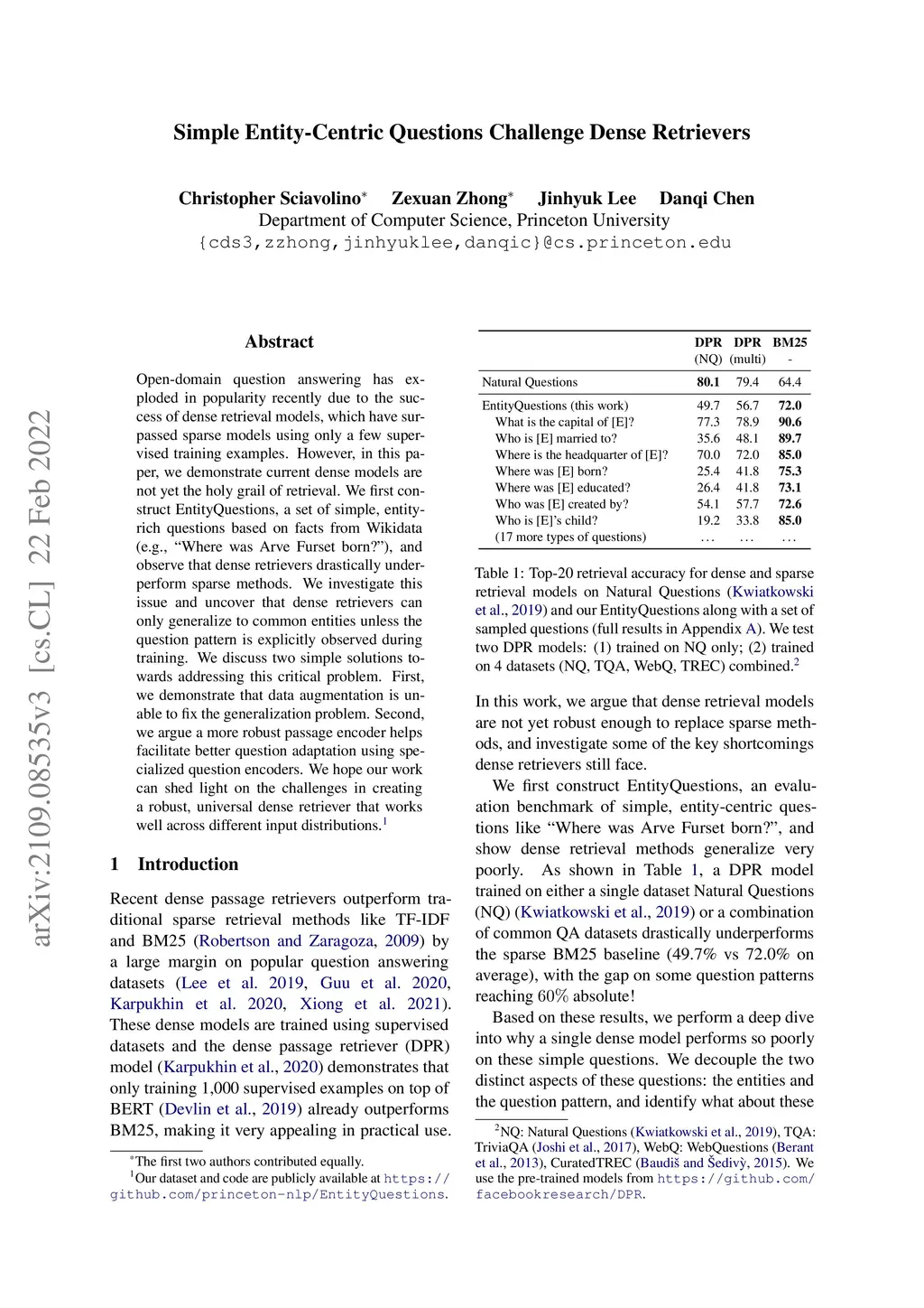 Open-domain question answering has exploded in popularity recently due to the success of dense retrieval models, which have surpassed sparse models using only a few supervised training examples. However, in this paper, we demonstrate current dense models are not yet the holy grail of retrieval. We first construct EntityQuestions, a set of simple, entity-rich questions based on facts from Wikidata (e.g., "Where was Arve Furset born?"), and observe that dense retrievers drastically underperform sparse methods. We investigate this issue and uncover that dense retrievers can only generalize to common entities unless the question pattern is explicitly observed during training. We discuss two simple solutions towards addressing this critical problem. First, we demonstrate that data augmentation is unable to fix the generalization problem. Second, we argue a more robust passage encoder helps facilitate better question adaptation using specialized question encoders. We hope our work can shed light on the challenges in creating a robust, universal dense retriever that works well across different input distributions.