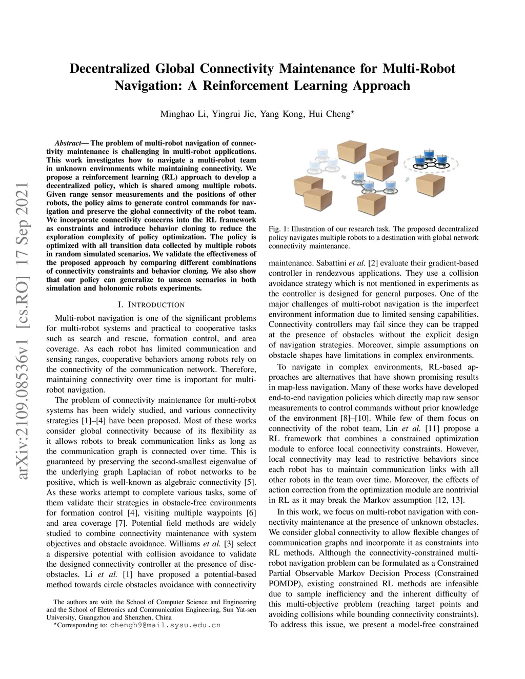The problem of multi-robot navigation of connectivity maintenance is challenging in multi-robot applications. This work investigates how to navigate a multi-robot team in unknown environments while maintaining connectivity. We propose a reinforcement learning (RL) approach to develop a decentralized policy, which is shared among multiple robots. Given range sensor measurements and the positions of other robots, the policy aims to generate control commands for navigation and preserve the global connectivity of the robot team. We incorporate connectivity concerns into the RL framework as constraints and introduce behavior cloning to reduce the exploration complexity of policy optimization. The policy is optimized with all transition data collected by multiple robots in random simulated scenarios. We validate the effectiveness of the proposed approach by comparing different combinations of connectivity constraints and behavior cloning. We also show that our policy can generalize to unseen scenarios in both simulation and holonomic robots experiments.