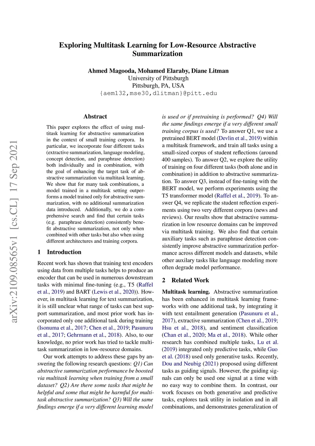 Exploring Multitask Learning for Low-Resource AbstractiveSummarization