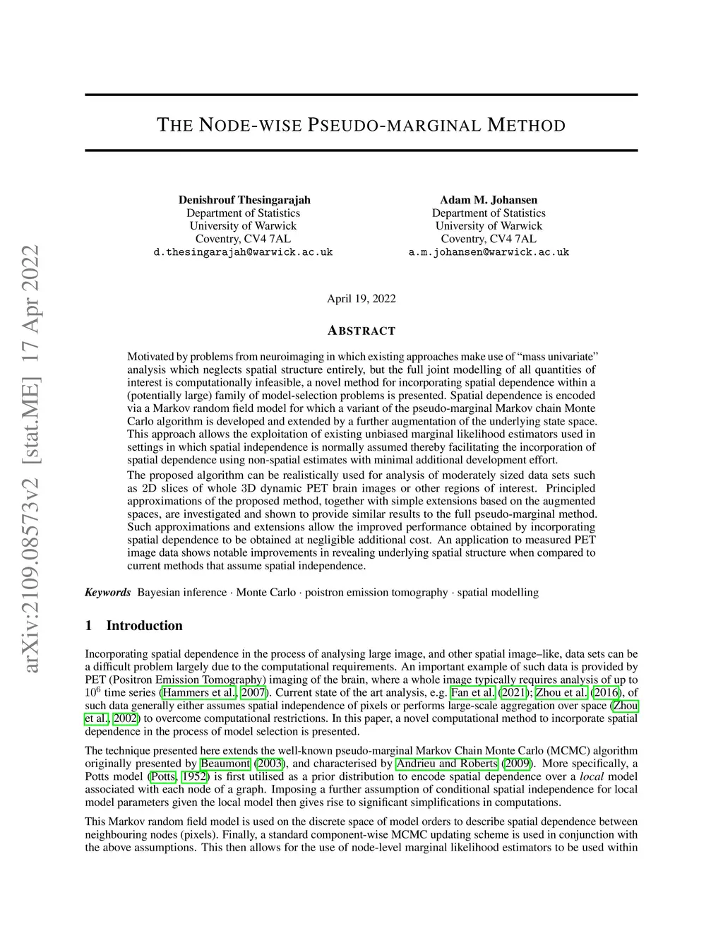 Motivated by problems from neuroimaging in which existing approaches make use of "mass univariate" analysis which neglects spatial structure entirely, but the full joint modelling of all quantities of interest is computationally infeasible, a novel method for incorporating spatial dependence within a (potentially large) family of model-selection problems is presented. Spatial dependence is encoded via a Markov random field model for which a variant of the pseudo-marginal Markov chain Monte Carlo algorithm is developed and extended by a further augmentation of the underlying state space. This approach allows the exploitation of existing unbiased marginal likelihood estimators used in settings in which spatial independence is normally assumed thereby facilitating the incorporation of spatial dependence using non-spatial estimates with minimal additional development effort. The proposed algorithm can be realistically used for analysis of %smaller subsets of large image moderately sized data sets such as D slices of whole D dynamic PET brain images or other regions of interest. Principled approximations of the proposed method, together with simple extensions based on the augmented spaces, are investigated and shown to provide similar results to the full pseudo-marginal method. Such approximations and extensions allow the improved performance obtained by incorporating spatial dependence to be obtained at negligible additional cost. An application to measured PET image data shows notable improvements in revealing underlying spatial structure when compared to current methods that assume spatial independence.