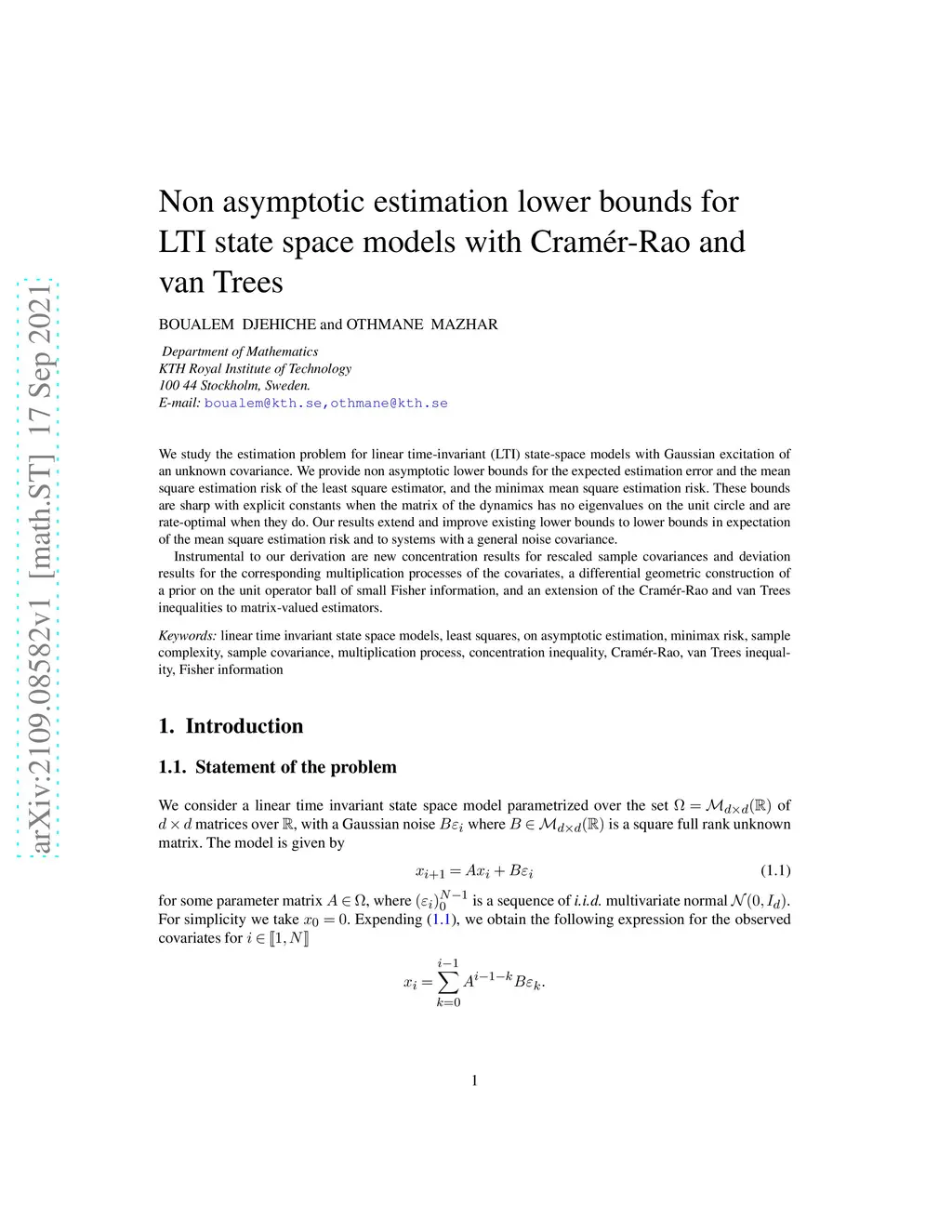 We study the estimation problem for linear time-invariant (LTI) state-space models with Gaussian excitation of an unknown covariance. We provide non asymptotic lower bounds for the expected estimation error and the mean square estimation risk of the least square estimator, and the minimax mean square estimation risk. These bounds are sharp with explicit constants when the matrix of the dynamics has no eigenvalues on the unit circle and are rate-optimal when they do. Our results extend and improve existing lower bounds to lower bounds in expectation of the mean square estimation risk and to systems with a general noise covariance. Instrumental to our derivation are new concentration results for rescaled sample covariances and deviation results for the corresponding multiplication processes of the covariates, a differential geometric construction of a prior on the unit operator ball of small Fisher information, and an extension of the Cram\ér-Rao and van Treesinequalities to matrix-valued estimators.