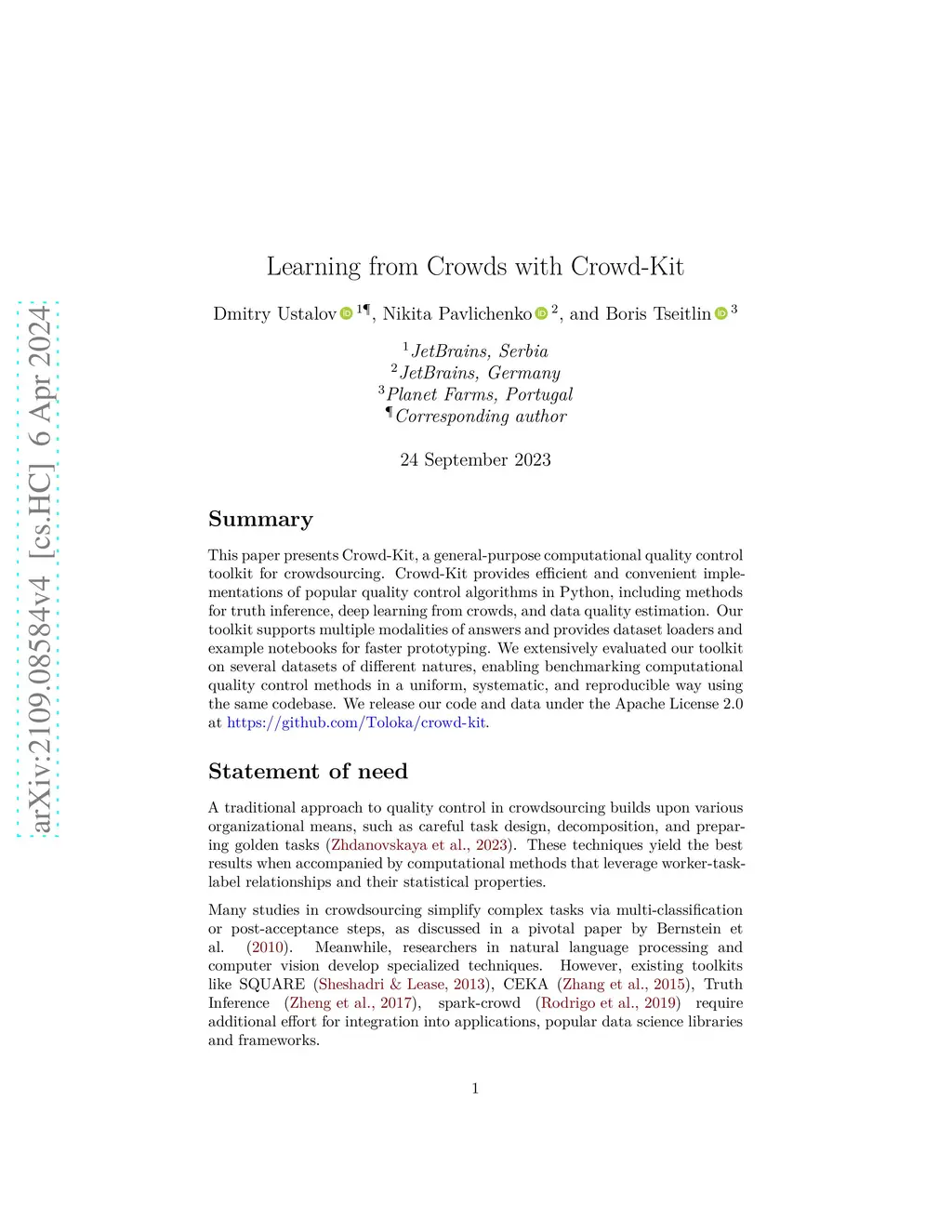 This paper presents Crowd-Kit, a general-purpose computational quality control toolkit for crowdsourcing. Crowd-Kit provides efficient and convenient implementations of popular quality control algorithms in Python, including methods for truth inference, deep learning from crowds, and data quality estimation. Our toolkit supports multiple modalities of answers and provides dataset loaders and example notebooks for faster prototyping. We extensively evaluated our toolkit on several datasets of different natures, enabling benchmarking computational quality control methods in a uniform, systematic, and reproducible way using the same codebase. We release our code and data under the Apache License 2.0 at https://github.com/Toloka/crowd-kit.