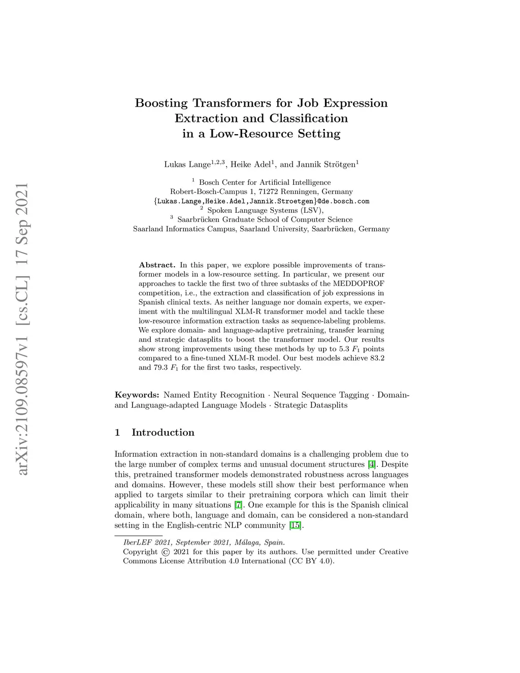In this paper, we explore possible improvements of transformer models in a low-resource setting. In particular, we present our approaches to tackle the first two of three subtasks of the MEDDOPROF competition, i.e., the extraction and classification of job expressions in Spanish clinical texts. As neither language nor domain experts, we experiment with the multilingual XLM-R transformer model and tackle these low-resource information extraction tasks as sequence-labeling problems. We explore domain- and language-adaptive pretraining, transfer learning and strategic datasplits to boost the transformer model. Our results show strong improvements using these methods by up to 5.3 F1 points compared to a fine-tuned XLM-R model. Our best models achieve 83.2 and 79.3 F1 for the first two tasks, respectively.