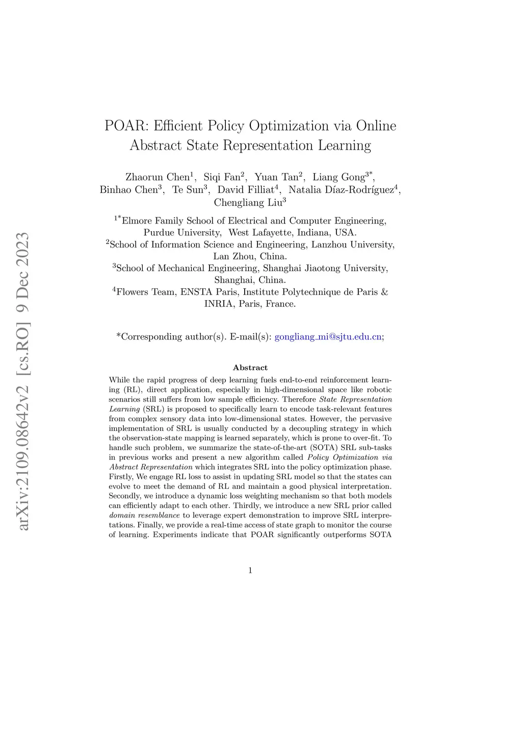 While the rapid progress of deep learning fuels end-to-end reinforcement learning (RL), direct application, especially in high-dimensional space like robotic scenarios still suffers from low sample efficiency. Therefore State Representation Learning (SRL) is proposed to specifically learn to encode task-relevant features from complex sensory data into low-dimensional states. However, the pervasive implementation of SRL is usually conducted by a decoupling strategy in which the observation-state mapping is learned separately, which is prone to over-fit. To handle such problem, we summarize the state-of-the-art (SOTA) SRL sub-tasks in previous works and present a new algorithm called Policy Optimization via Abstract Representation which integrates SRL into the policy optimization phase. Firstly, We engage RL loss to assist in updating SRL model so that the states can evolve to meet the demand of RL and maintain a good physical interpretation. Secondly, we introduce a dynamic loss weighting mechanism so that both models can efficiently adapt to each other. Thirdly, we introduce a new SRL prior called domain resemblance to leverage expert demonstration to improve SRL interpretations. Finally, we provide a real-time access of state graph to monitor the course of learning. Experiments indicate that POAR significantly outperforms SOTA RL algorithms and decoupling SRL strategies in terms of sample efficiency and final rewards. We empirically verify POAR to efficiently handle tasks in high dimensions and facilitate training real-life robots directly from scratch.