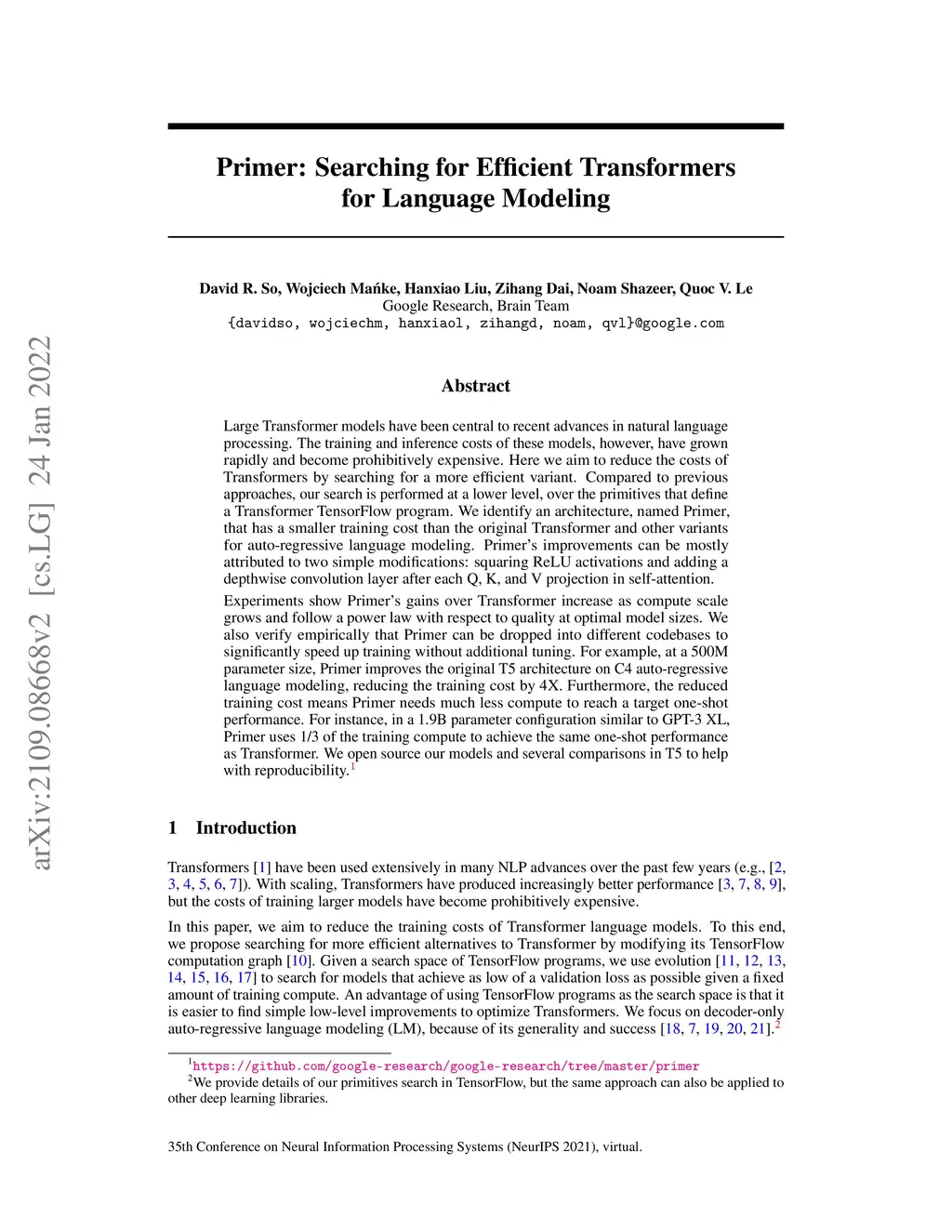 Large Transformer models have been central to recent advances in natural language processing. The training and inference costs of these models, however, have grown rapidly and become prohibitively expensive. Here we aim to reduce the costs of Transformers by searching for a more efficient variant. Compared to previous approaches, our search is performed at a lower level, over the primitives that define a Transformer TensorFlow program. We identify an architecture, named Primer, that has a smaller training cost than the original Transformer and other variants for auto-regressive language modeling. Primer's improvements can be mostly attributed to two simple modifications: squaring ReLU activations and adding a depthwise convolution layer after each Q, K, and V projection in self-attention. Experiments show Primer's gains over Transformer increase as compute scale grows and follow a power law with respect to quality at optimal model sizes. We also verify empirically that Primer can be dropped into different codebases to significantly speed up training without additional tuning. For example, at a 500M parameter size, Primer improves the original T5 architecture on C4 auto-regressive language modeling, reducing the training cost by 4X. Furthermore, the reduced training cost means Primer needs much less compute to reach a target one-shot performance. For instance, in a 1.9B parameter configuration similar to GPT-3 XL, Primer uses 1/3 of the training compute to achieve the same one-shot performance as Transformer. We open source our models and several comparisons in T5 to help with reproducibility.