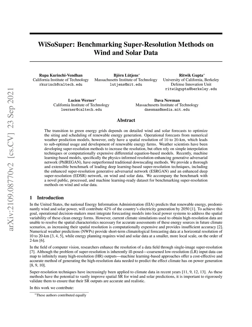 The transition to green energy grids depends on detailed wind and solar forecasts to optimize the siting and scheduling of renewable energy generation. Operational forecasts from numerical weather prediction models, however, only have a spatial resolution of 10 to 20-km, which leads to sub-optimal usage and development of renewable energy farms. Weather scientists have been developing super-resolution methods to increase the resolution, but often rely on simple interpolation techniques or computationally expensive differential equation-based models. Recently, machine learning-based models, specifically the physics-informed resolution-enhancing generative adversarial network (PhIREGAN), have outperformed traditional downscaling methods. We provide a thorough and extensible benchmark of leading deep learning-based super-resolution techniques, including the enhanced super-resolution generative adversarial network (ESRGAN) and an enhanced deep super-resolution (EDSR) network, on wind and solar data. We accompany the benchmark with a novel public, processed, and machine learning-ready dataset for benchmarking super-resolution methods on wind and solar data.
