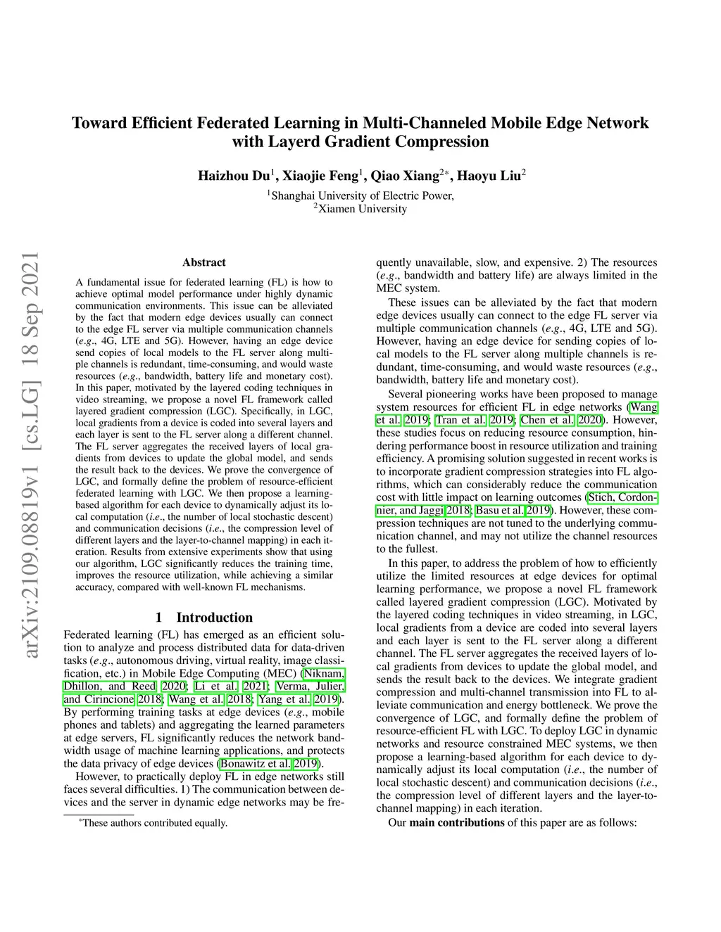 A fundamental issue for federated learning (FL) is how to achieve optimal model performance under highly dynamic communication environments. This issue can be alleviated by the fact that modern edge devices usually can connect to the edge FL server via multiple communication channels (e.g., 4G, LTE and 5G). However, having an edge device send copies of local models to the FL server along multiple channels is redundant, time-consuming, and would waste resources (e.g., bandwidth, battery life and monetary cost). In this paper, motivated by the layered coding techniques in video streaming, we propose a novel FL framework called layered gradient compression (LGC). Specifically, in LGC, local gradients from a device is coded into several layers and each layer is sent to the FL server along a different channel. The FL server aggregates the received layers of local gradients from devices to update the global model, and sends the result back to the devices. We prove the convergence of LGC, and formally define the problem of resource-efficient federated learning with LGC. We then propose a learning based algorithm for each device to dynamically adjust its local computation (i.e., the number of local stochastic descent) and communication decisions (i.e.,the compression level of different layers and the layer to channel mapping) in each iteration. Results from extensive experiments show that using our algorithm, LGC significantly reduces the training time, improves the resource utilization, while achieving a similar accuracy, compared with well-known FL mechanisms.