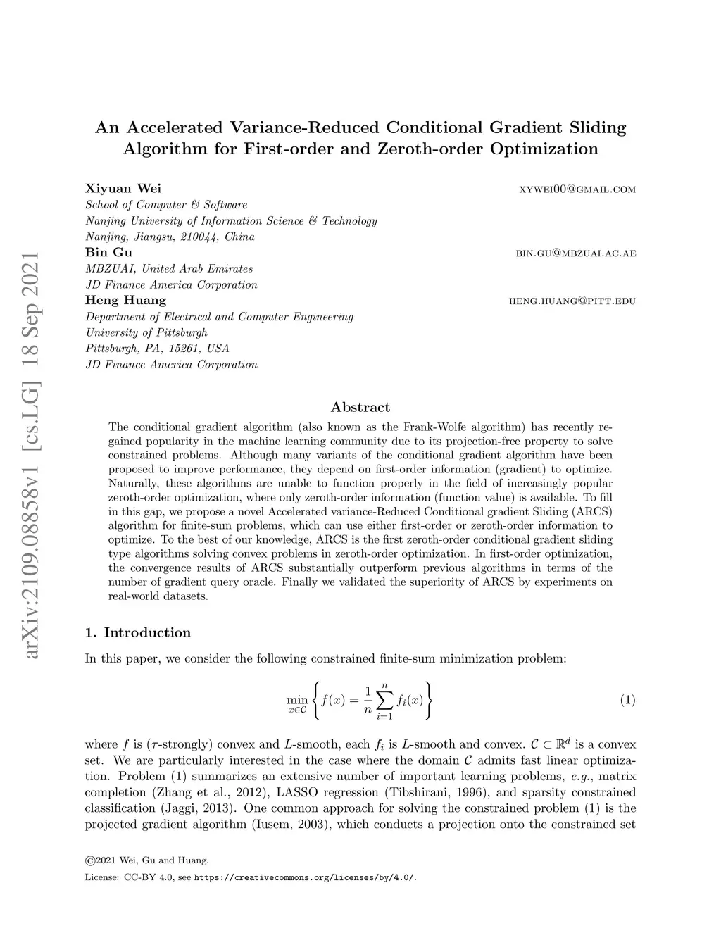The conditional gradient algorithm (also known as the Frank-Wolfe algorithm) has recently regained popularity in the machine learning community due to its projection-free property to solve constrained problems. Although many variants of the conditional gradient algorithm have been proposed to improve performance, they depend on first-order information (gradient) to optimize. Naturally, these algorithms are unable to function properly in the field of increasingly popular zeroth-order optimization, where only zeroth-order information (function value) is available. To fill in this gap, we propose a novel Accelerated variance-Reduced Conditional gradient Sliding (ARCS) algorithm for finite-sum problems, which can use either first-order or zeroth-order information to optimize. To the best of our knowledge, ARCS is the first zeroth-order conditional gradient sliding type algorithms solving convex problems in zeroth-order optimization. In first-order optimization, the convergence results of ARCS substantially outperform previous algorithms in terms of the number of gradient query oracle. Finally we validated the superiority of ARCS by experiments on real-world datasets.