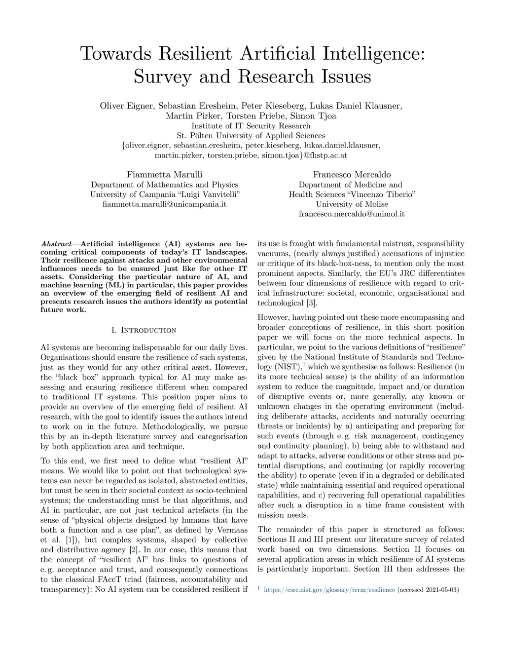 Towards Resilient Artificial Intelligence: Survey and Research Issues