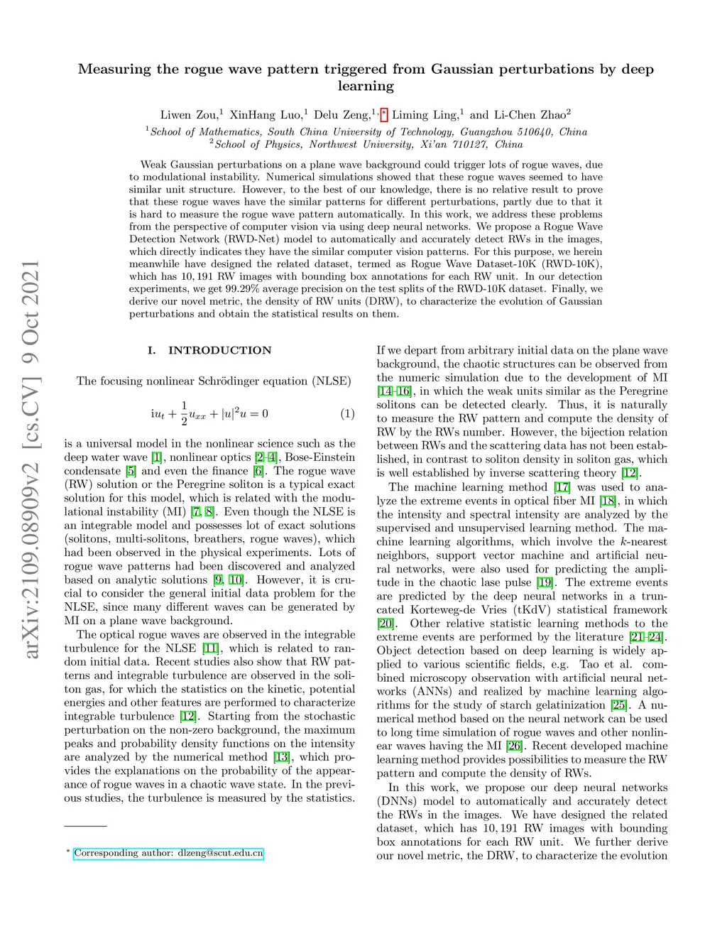 Weak Gaussian perturbations on a plane wave background could trigger lots of rogue waves, due to modulational instability. Numerical simulations showed that these rogue waves seemed to have similar unit structure. However, to the best of our knowledge, there is no relative result to prove that these rogue waves have the similar patterns for different perturbations, partly due to that it is hard to measure the rogue wave pattern automatically. In this work, we address these problems from the perspective of computer vision via using deep neural networks. We propose a Rogue Wave Detection Network (RWD-Net) model to automatically and accurately detect RWs on the images, which directly indicates they have the similar computer vision patterns. For this purpose, we herein meanwhile have designed the related dataset, termed as Rogue Wave Dataset-K (RWD-K), which has RW images with bounding box annotations for each RW unit. In our detection experiments, we get average precision on the test splits of the RWD-K dataset. Finally, we derive our novel metric, the density of RW units (DRW), to characterize the evolution of Gaussian perturbations and obtain the statistical results on them.