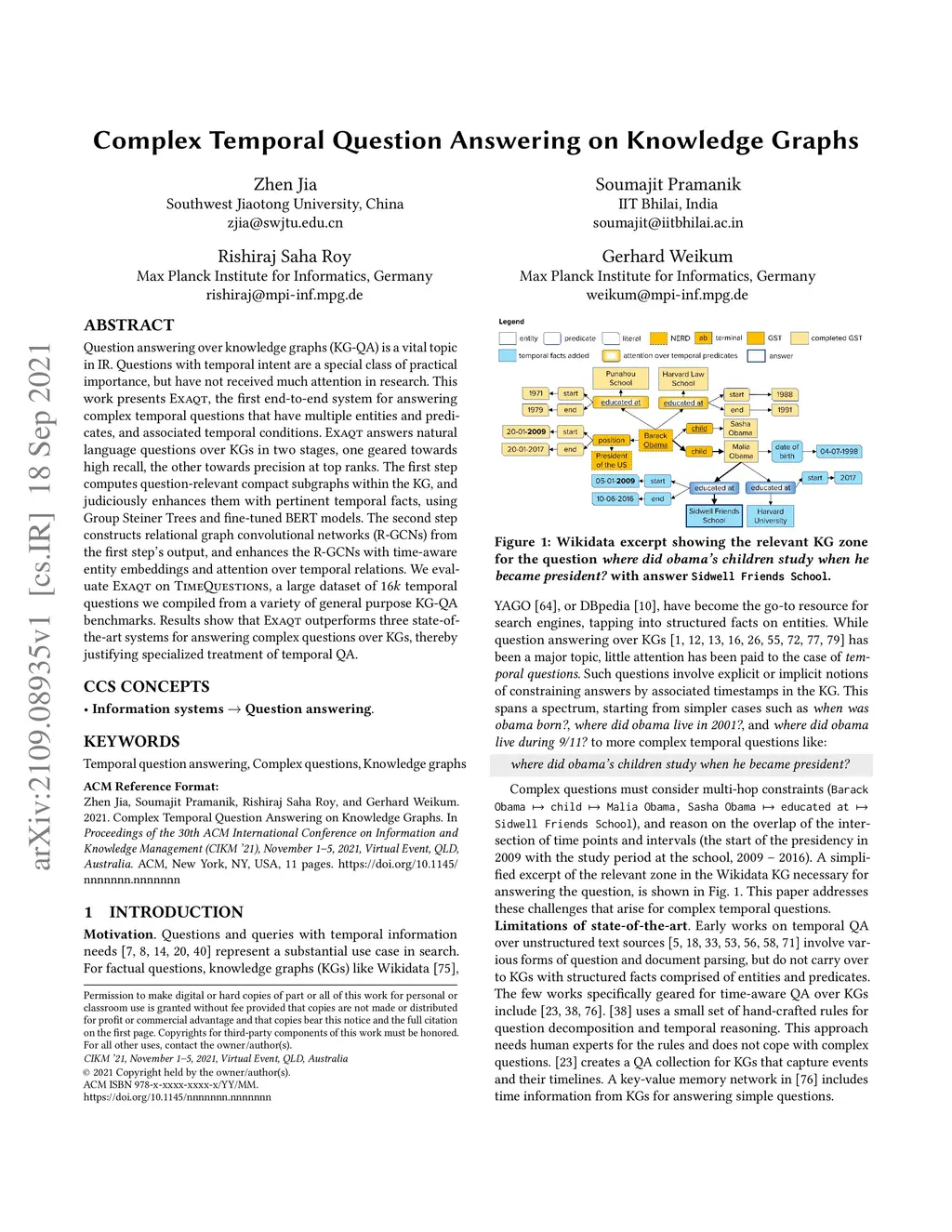 Question answering over knowledge graphs (KG-QA) is a vital topic in IR. Questions with temporal intent are a special class of practical importance, but have not received much attention in research. This work presents EXAQT, the first end-to-end system for answering complex temporal questions that have multiple entities and predicates, and associated temporal conditions. EXAQT answers natural language questions over KGs in two stages, one geared towards high recall, the other towards precision at top ranks. The first step computes question-relevant compact subgraphs within the KG, and judiciously enhances them with pertinent temporal facts, using Group Steiner Trees and fine-tuned BERT models. The second step constructs relational graph convolutional networks (R-GCNs) from the first step's output, and enhances the R-GCNs with time-aware entity embeddings and attention over temporal relations. We evaluate EXAQT on TimeQuestions, a large dataset of 16k temporal questions we compiled from a variety of general purpose KG-QA benchmarks. Results show that EXAQT outperforms three state-of-the-art systems for answering complex questions over KGs, thereby justifying specialized treatment of temporal QA.