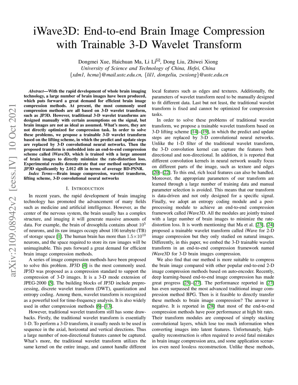 With the rapid development of whole brain imaging technology, a large number of brain images have been produced, which puts forward a great demand for efficient brain image compression methods. At present, the most commonly used compression methods are all based on 3-D wavelet transform, such as JP3D. However, traditional 3-D wavelet transforms are designed manually with certain assumptions on the signal, but brain images are not as ideal as assumed. What's more, they are not directly optimized for compression task. In order to solve these problems, we propose a trainable 3-D wavelet transform based on the lifting scheme, in which the predict and update steps are replaced by 3-D convolutional neural networks. Then the proposed transform is embedded into an end-to-end compression scheme called iWave3D, which is trained with a large amount of brain images to directly minimize the rate-distortion loss. Experimental results demonstrate that our method outperforms JP3D significantly by 2.012 dB in terms of average BD-PSNR.