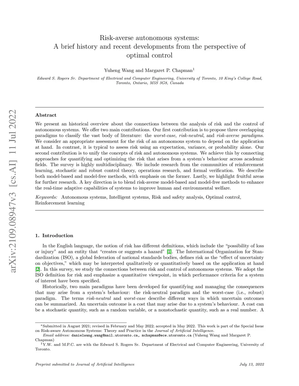 We present an historical overview about the connections between the analysis of risk and the control of autonomous systems. We offer two main contributions. Our first contribution is to propose three overlapping paradigms to classify the vast body of literature: the worst-case, risk-neutral, and risk-averse paradigms. We consider an appropriate assessment for the risk of an autonomous system to depend on the application at hand. In contrast, it is typical to assess risk using an expectation, variance, or probability alone. Our second contribution is to unify the concepts of risk and autonomous systems. We achieve this by connecting approaches for quantifying and optimizing the risk that arises from a system's behaviour across academic fields. The survey is highly multidisciplinary. We include research from the communities of reinforcement learning, stochastic and robust control theory, operations research, and formal verification. We describe both model-based and model-free methods, with emphasis on the former. Lastly, we highlight fruitful areas for further research. A key direction is to blend risk-averse model-based and model-free methods to enhance the real-time adaptive capabilities of systems to improve human and environmental welfare.
