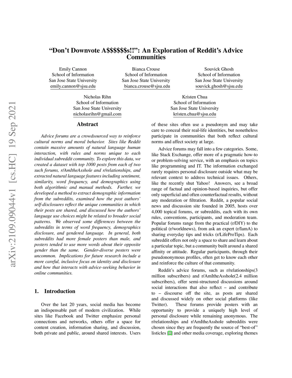 Advice forums are a crowdsourced way to reinforce cultural norms and moral behavior. Sites like Reddit contain massive amounts of natural language human interaction, with rules and norms unique to each individual subreddit community. To explore this data, we created a dataset with top 1000 posts from each of two such forums, r/AmItheAsshole and r/relationships, and extracted natural language features including sentiment, similarity, word frequency, and demographics using both algorithmic and manual methods. Further, we developed a method to extract demographic information from the subreddits, examined how the post authors' self-disclosures reflect the unique communities in which their posts are shared, and discussed how the authors' language use choices might be related to broader social patterns. We observed some differences between the subreddits in terms of word frequency, demographics disclosure, and gendered language. In general, both subreddits had more female posters than male, and posters tended to use more words about their opposite gender than the same. Gender-diverse posters were uncommon. Implications for future research include a more careful, inclusive focus on identity and disclosure and how that interacts with advice-seeking behavior in online communities.