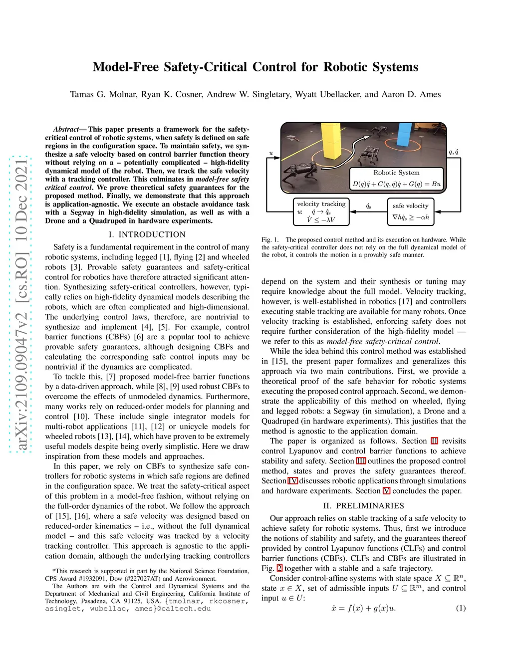 This paper presents a framework for the safety-critical control of robotic systems, when safety is defined on safe regions in the configuration space. To maintain safety, we synthesize a safe velocity based on control barrier function theory without relying on a -- potentially complicated -- high-fidelity dynamical model of the robot. Then, we track the safe velocity with a tracking controller. This culminates in model-free safety critical control. We prove theoretical safety guarantees for the proposed method. Finally, we demonstrate that this approach is application-agnostic. We execute an obstacle avoidance task with a Segway in high-fidelity simulation, as well as with a Drone and a Quadruped in hardware experiments.