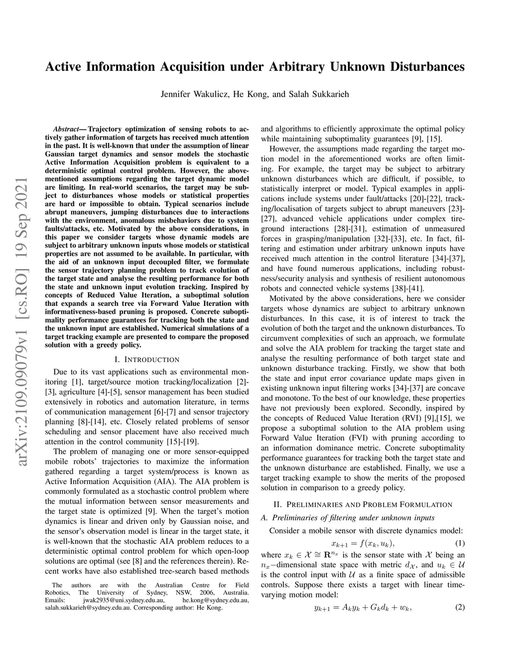 Trajectory optimization of sensing robots to actively gather information of targets has received much attention in the past. It is well-known that under the assumption of linear Gaussian target dynamics and sensor models the stochastic Active Information Acquisition problem is equivalent to a deterministic optimal control problem. However, the above-mentioned assumptions regarding the target dynamic model are limiting. In real-world scenarios, the target may be subject to disturbances whose models or statistical properties are hard or impossible to obtain. Typical scenarios include abrupt maneuvers, jumping disturbances due to interactions with the environment, anomalous misbehaviors due to system faults/attacks, etc. Motivated by the above considerations, in this paper we consider targets whose dynamic models are subject to arbitrary unknown inputs whose models or statistical properties are not assumed to be available. In particular, with the aid of an unknown input decoupled filter, we formulate the sensor trajectory planning problem to track evolution of the target state and analyse the resulting performance for both the state and unknown input evolution tracking. Inspired by concepts of Reduced Value Iteration, a suboptimal solution that expands a search tree via Forward Value Iteration with informativeness-based pruning is proposed. Concrete suboptimality performance guarantees for tracking both the state and the unknown input are established. Numerical simulations of a target tracking example are presented to compare the proposed solution with a greedy policy.