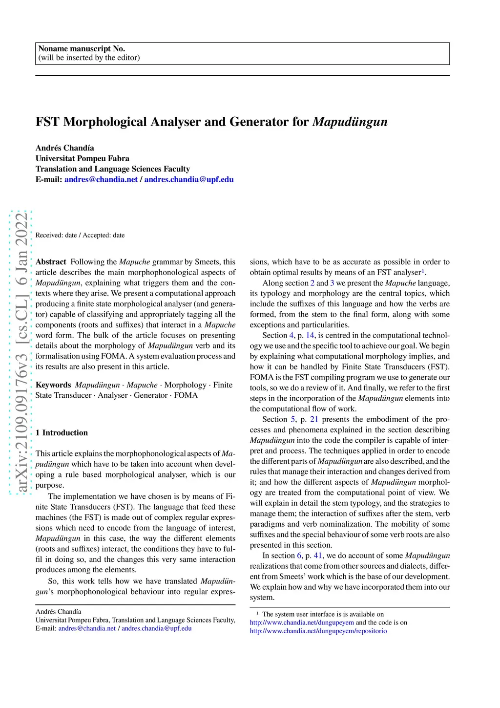 Following the Mapuche grammar by Smeets, this article describes the main morphophonological aspects of Mapud\"ungun, explaining what triggers them and the contexts where they arise. We present a computational approach producing a finite state morphological analyser (and generator) capable of classifying and appropriately tagging all the components (roots and suffixes) that interact in a Mapuche word form. The bulk of the article focuses on presenting details about the morphology of Mapud\"ungun verb and its formalisation using FOMA. A system evaluation process and its results are also present in this article.