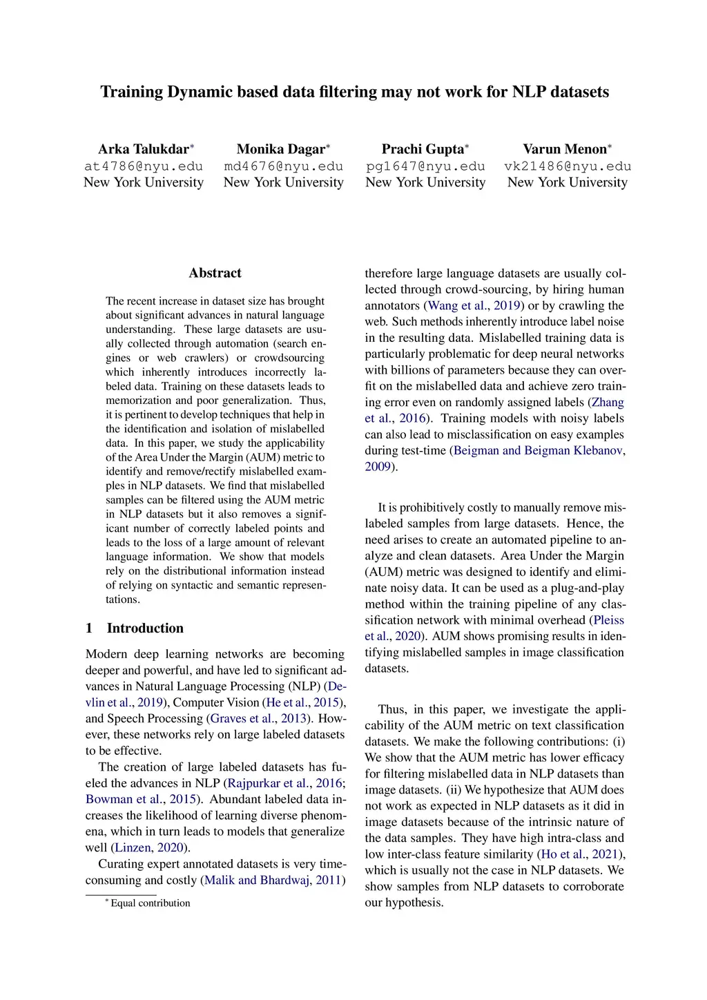 The recent increase in dataset size has brought about significant advances in natural language understanding. These large datasets are usually collected through automation (search engines or web crawlers) or crowdsourcing which inherently introduces incorrectly labeled data. Training on these datasets leads to memorization and poor generalization. Thus, it is pertinent to develop techniques that help in the identification and isolation of mislabelled data. In this paper, we study the applicability of the Area Under the Margin (AUM) metric to identify and remove/rectify mislabelled examples in NLP datasets. We find that mislabelled samples can be filtered using the AUM metric in NLP datasets but it also removes a significant number of correctly labeled points and leads to the loss of a large amount of relevant language information. We show that models rely on the distributional information instead of relying on syntactic and semantic representations.