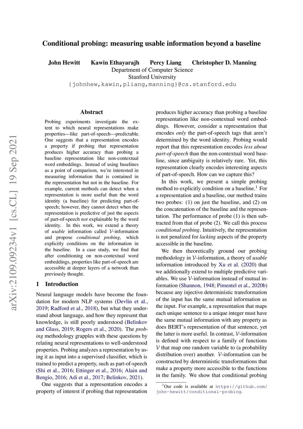 Probing experiments investigate the extent to which neural representations make properties -- like part-of-speech -- predictable. One suggests that a representation encodes a property if probing that representation produces higher accuracy than probing a baseline representation like non-contextual word embeddings. Instead of using baselines as a point of comparison, we're interested in measuring information that is contained in the representation but not in the baseline. For example, current methods can detect when a representation is more useful than the word identity (a baseline) for predicting part-of-speech; however, they cannot detect when the representation is predictive of just the aspects of part-of-speech not explainable by the word identity. In this work, we extend a theory of usable information called -information and propose conditional probing, which explicitly conditions on the information in the baseline. In a case study, we find that after conditioning on non-contextual word embeddings, properties like part-of-speech are accessible at deeper layers of a network than previously thought.
