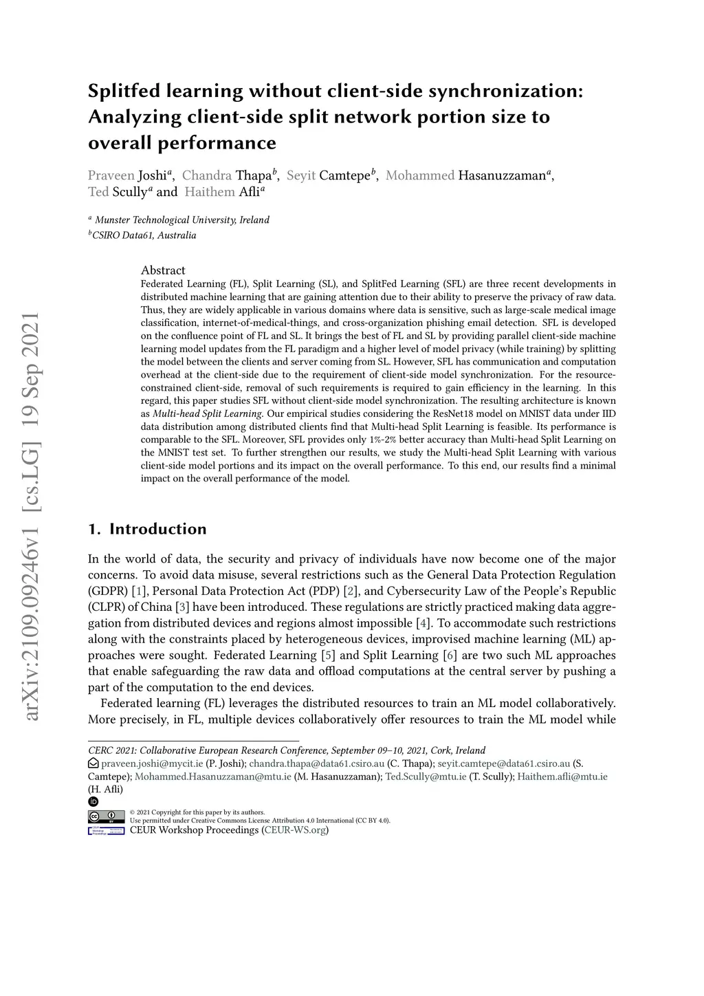 Federated Learning (FL), Split Learning (SL), and SplitFed Learning (SFL) are three recent developments in distributed machine learning that are gaining attention due to their ability to preserve the privacy of raw data. Thus, they are widely applicable in various domains where data is sensitive, such as large-scale medical image classification, internet-of-medical-things, and cross-organization phishing email detection. SFL is developed on the confluence point of FL and SL. It brings the best of FL and SL by providing parallel client-side machine learning model updates from the FL paradigm and a higher level of model privacy (while training) by splitting the model between the clients and server coming from SL. However, SFL has communication and computation overhead at the client-side due to the requirement of client-side model synchronization. For the resource-constrained client-side, removal of such requirements is required to gain efficiency in the learning. In this regard, this paper studies SFL without client-side model synchronization. The resulting architecture is known as Multi-head Split Learning. Our empirical studies considering the ResNet18 model on MNIST data under IID data distribution among distributed clients find that Multi-head Split Learning is feasible. Its performance is comparable to the SFL. Moreover, SFL provides only 1%-2% better accuracy than Multi-head Split Learning on the MNIST test set. To further strengthen our results, we study the Multi-head Split Learning with various client-side model portions and its impact on the overall performance. To this end, our results find a minimal impact on the overall performance of the model.