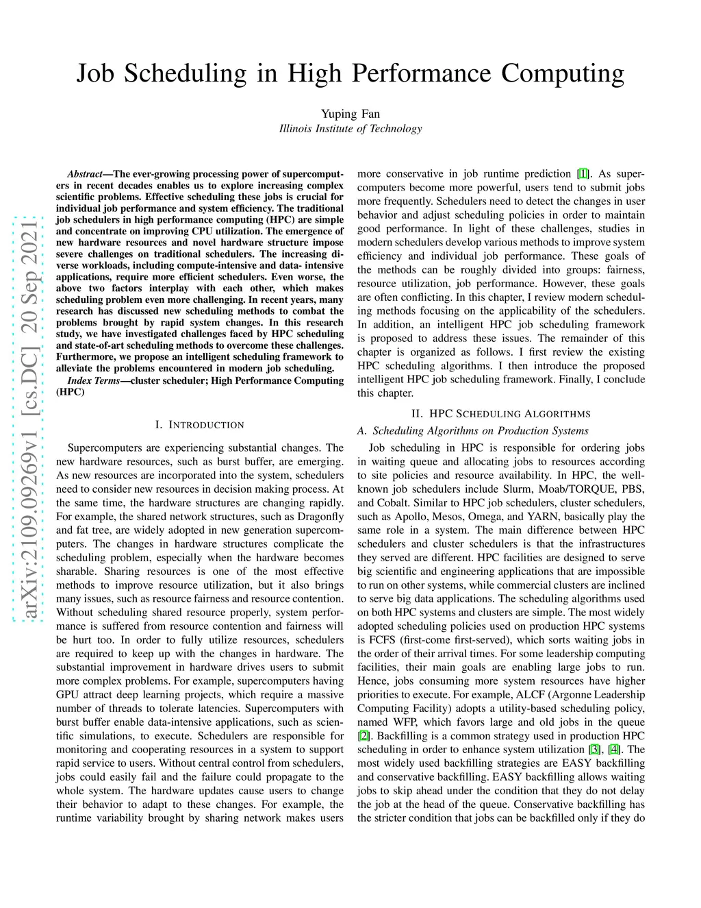 The ever-growing processing power of supercomputers in recent decades enables us to explore increasing complex scientific problems. Effective scheduling these jobs is crucial for individual job performance and system efficiency. The traditional job schedulers in high performance computing (HPC) are simple and concentrate on improving CPU utilization. The emergence of new hardware resources and novel hardware structure impose severe challenges on traditional schedulers. The increasing diverse workloads, including compute-intensive and data-intensive applications, require more efficient schedulers. Even worse, the above two factors interplay with each other, which makes scheduling problem even more challenging. In recent years, many research has discussed new scheduling methods to combat the problems brought by rapid system changes. In this research study, we have investigated challenges faced by HPC scheduling and state-of-art scheduling methods to overcome these challenges. Furthermore, we propose an intelligent scheduling framework to alleviate the problems encountered in modern job scheduling.