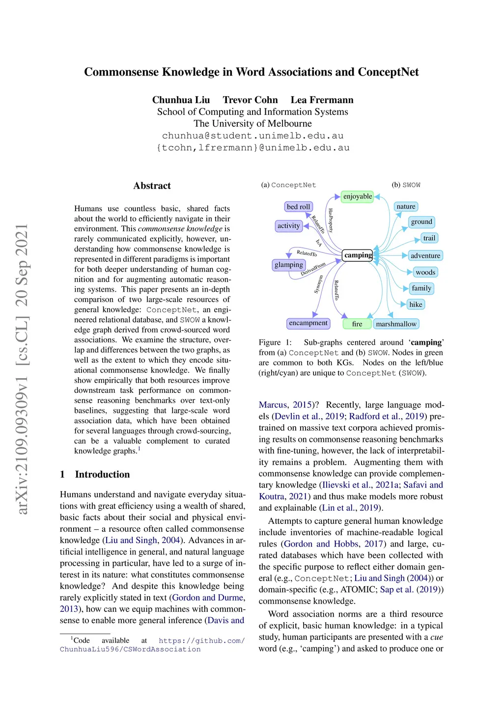 Humans use countless basic, shared facts about the world to efficiently navigate in their environment. This commonsense knowledge is rarely communicated explicitly, however, understanding how commonsense knowledge is represented in different paradigms is important for both deeper understanding of human cognition and for augmenting automatic reasoning systems. This paper presents an in-depth comparison of two large-scale resources of general knowledge: ConcpetNet, an engineered relational database, and SWOW a knowledge graph derived from crowd-sourced word associations. We examine the structure, overlap and differences between the two graphs, as well as the extent to which they encode situational commonsense knowledge. We finally show empirically that both resources improve downstream task performance on commonsense reasoning benchmarks over text-only baselines, suggesting that large-scale word association data, which have been obtained for several languages through crowd-sourcing, can be a valuable complement to curated knowledge graphs